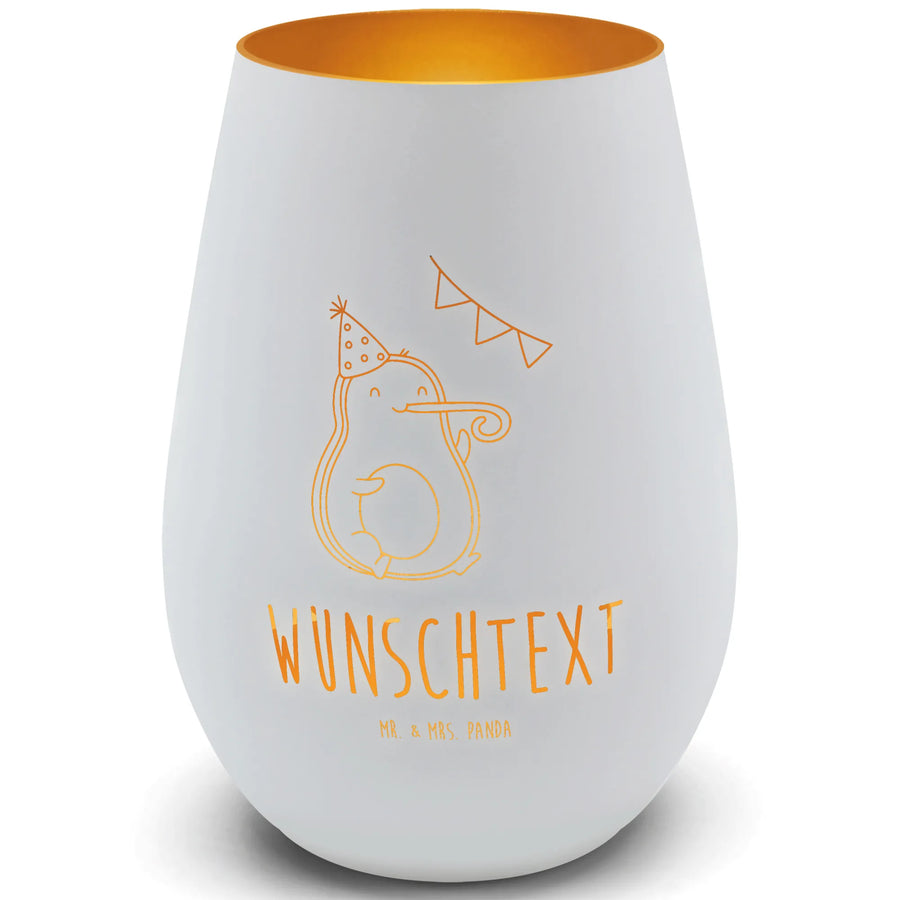 Das Gold Windlicht Personalisiert mit dem süßen Avocado Party Time Motiv von Mr. & Mrs. Panda ist das perfekte Geschenk für alle, die Partylaune und gute Stimmung lieben! Dieses wunderschöne und edle Windlicht zieht garantiert alle Blicke auf sich und sorgt für eine gemütliche Atmosphäre in jedem Raum.