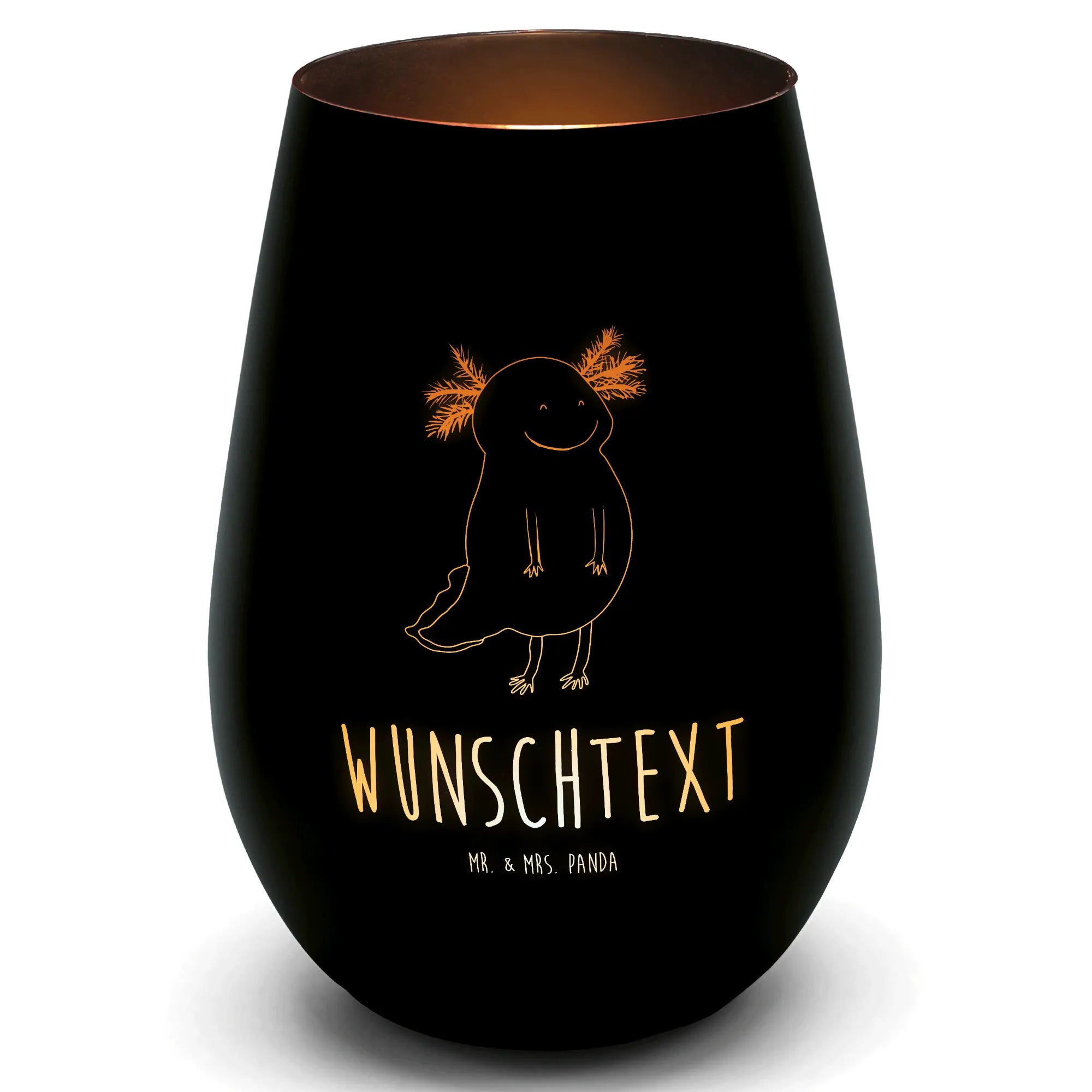 Entdecke das bezaubernde Gold Windlicht Personalisiert mit dem fröhlichen Axolotl-Motiv "Axolotl glücklich" von Mr. & Mrs. Panda!
