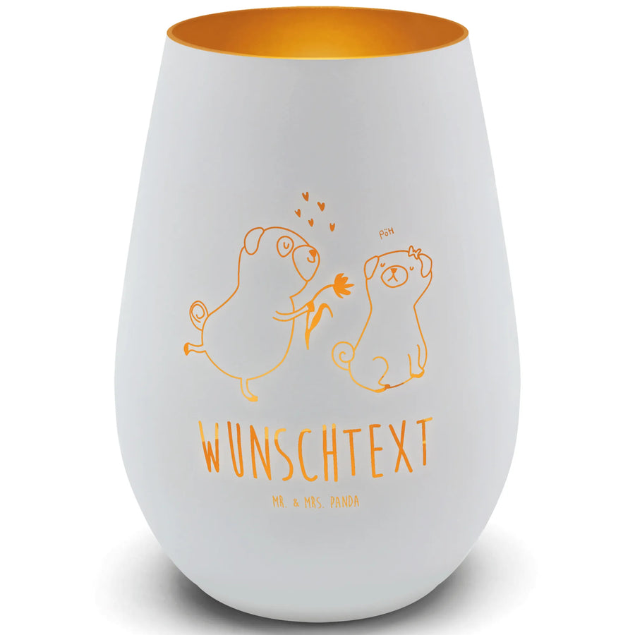 Das Gold Windlicht Personalisiert mit dem liebevollen Mops-Motiv "verliebt" ist das perfekte Geschenk für alle Hundeliebhaber! Es wird aus hochwertigem Glas gefertigt und strahlt durch seine goldene Farbe eine besondere Eleganz aus.