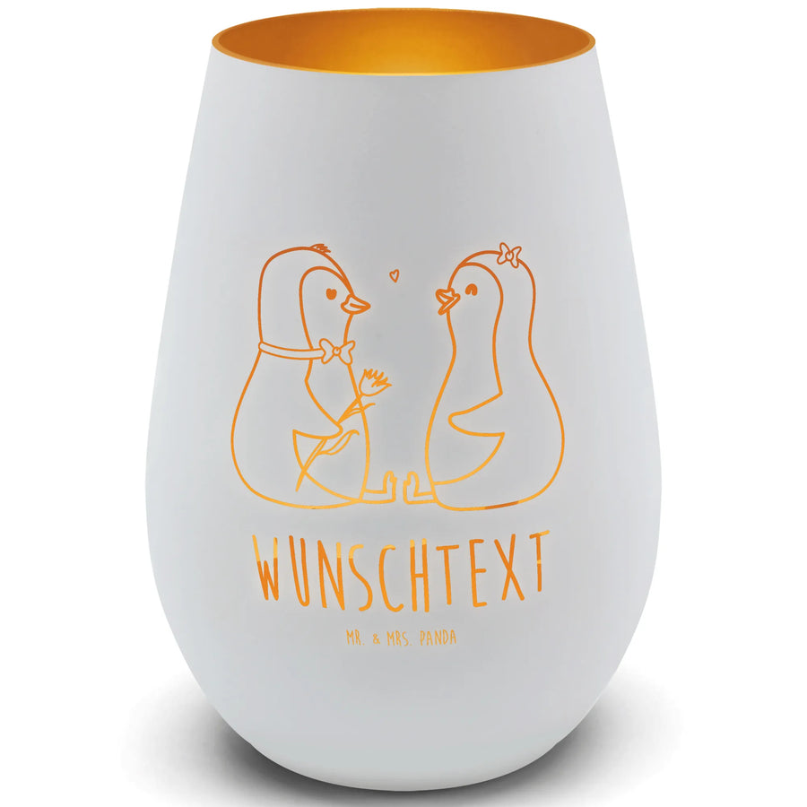 Das Gold Windlicht Personalisiert mit dem süßen Motiv des Pinguin Pärchens von Mr. & Mrs. Panda ist das perfekte Geschenk für alle Verliebten. Mit den Maßen von 120 mm Höhe und 85 mm Durchmesser ist es nicht nur schön anzusehen, sondern auch ideal geeignet für handelsübliche Teelichter.