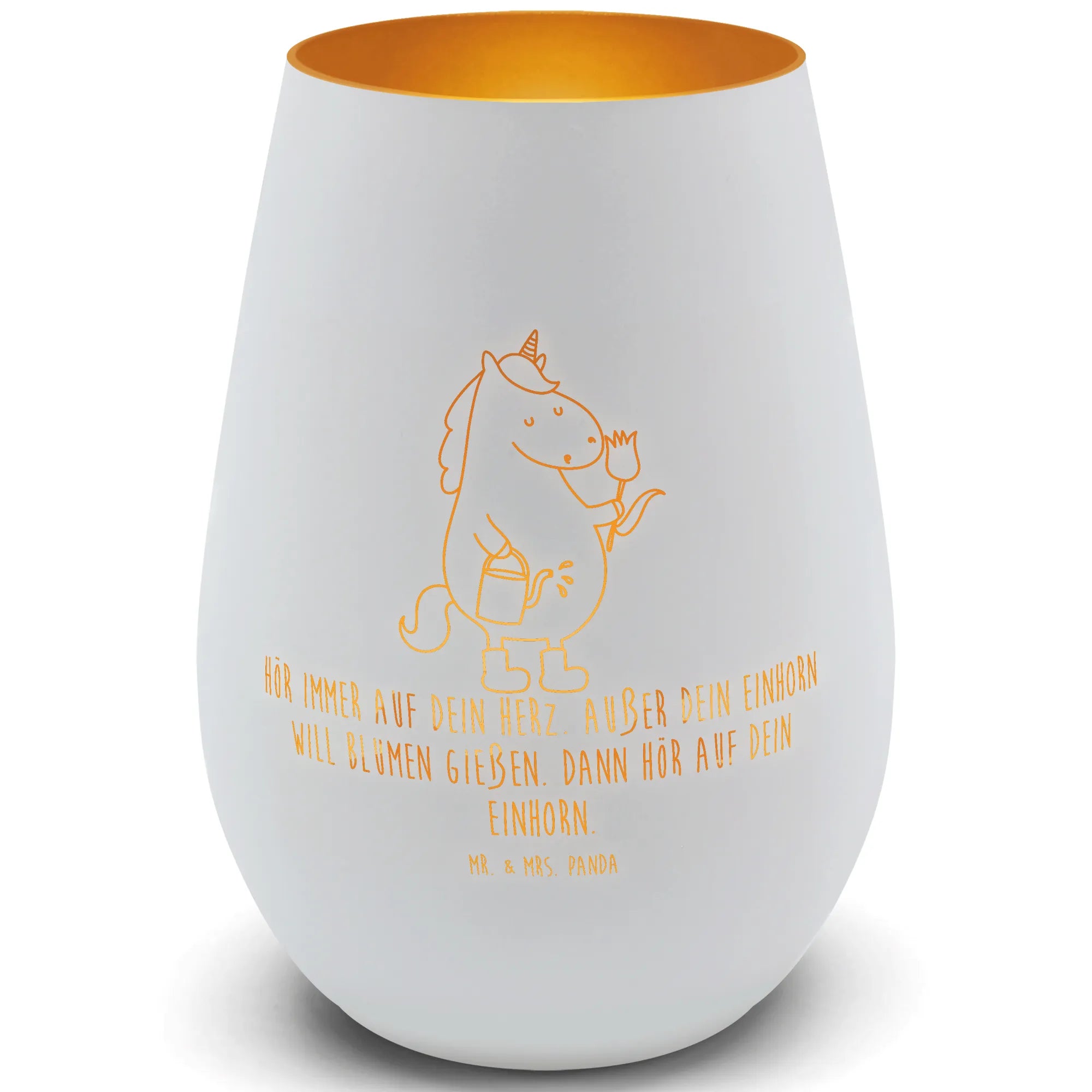 Das Gold Windlicht Einhorn Gärtner von Mr. & Mrs. Panda ist das perfekte Geschenk für alle, die die zauberhafte Welt der Einhörner lieben. Mit seinem liebevoll handgezeichneten Motiv eines Einhorns, das leidenschaftlich gerne im Garten arbeitet, bringt dieses Windlicht nicht nur Licht in dein Zuhause, sondern auch Freude und eine Portion Magie.