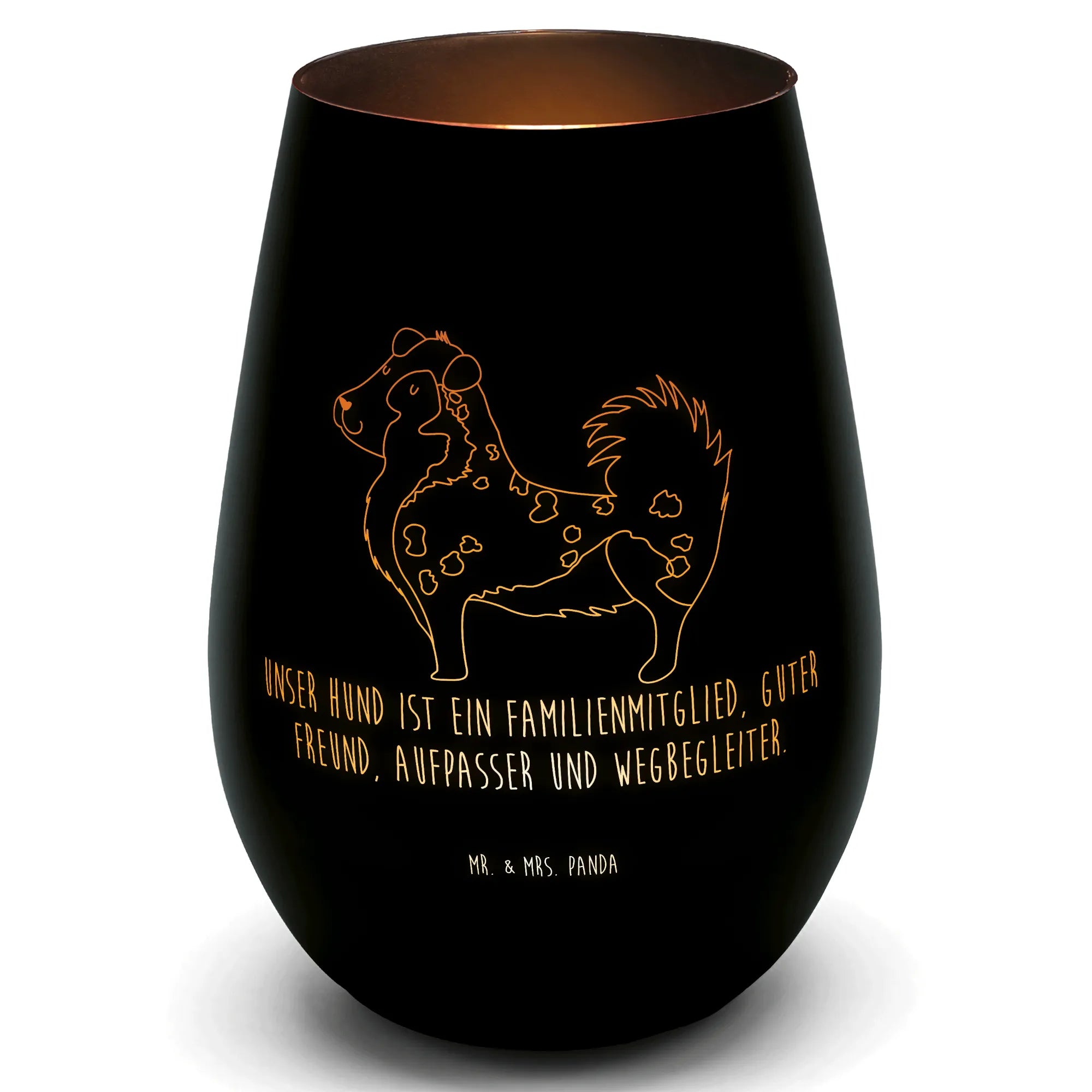 Dieses Gold Windlicht von Mr. & Mrs. Panda vereint edles Design und liebevolle Botschaft. Das Windlicht Goldfarben ist mit einem handgezeichneten Australian Shepherd Motiv und dem Spruch „Unser Hund ist ein Familienmitglied, guter Freund, Aufpasser und Wegbegleiter.“ graviert – eine zärtliche Erinnerung an deinen treuen Vierbeiner.