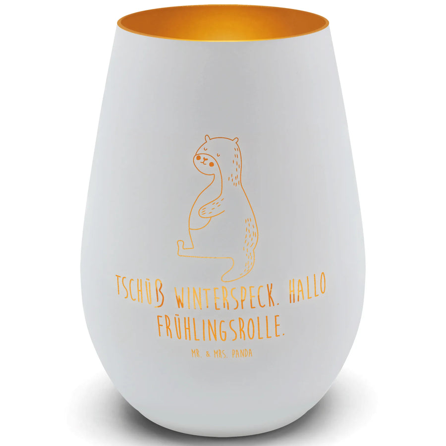 Entdecke das zauberhafte Gold Windlicht von Mr. & Mrs. Panda, das mit seinen liebevollen gravierten Motiven und Sprüchen für eine stimmungsvolle Atmosphäre sorgt. Das Windlicht hat eine Höhe von 120 mm und einen Durchmesser von 85 mm und ist aus hochwertigem Glas gefertigt, das sowohl innen als auch außen lackiert ist. Ideal geeignet für handelsübliche Teelichter, schafft es eine gemütliche und romantische Szene, perfekt für besondere Anlässe oder einfach gemütliche Abende zu Hause. Es schützt die Flamme vor Wind und ist hitzebeständig. Ein besonderes Merkmal des Windlichts ist der matte Effekt, der durch die Erhitzung des Materials entsteht – einfach magisch! Pflegeleicht, mit sanfter Handwäsche ist es schnell gereinigt und kannst du es problemlos in der Spülmaschine reinigen. Das Gold Windlicht wird mit Teelicht geliefert, damit du sofort für Stimmung sorgen kannst.