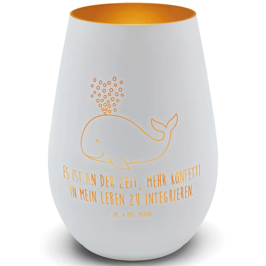 Ein wunderschönes und edles Gold Windlicht mit Gravur von Mr. & Mrs. Panda – das perfekte Geschenk für alle, die Meerestiere und eine fröhliche, motivierende Deko lieben! Das Windlicht mit dem zauberhaften Wal Konfetti-Motiv ist mehr als nur ein Lichtspender. Es bringt den Zauber des Meeres direkt in dein Zuhause und sorgt für gemütliche und romantische Stimmung. Der hübsche blaue Wal, der mit geschlossenen Augen und einem sanften Lächeln dahinschwebt, wird von einem bunten Konfetti-Himmel umgeben. Diese Darstellung schafft eine fröhliche Atmosphäre, ideal für Feierlichkeiten, aber auch für entspannte Abende zu Hause.