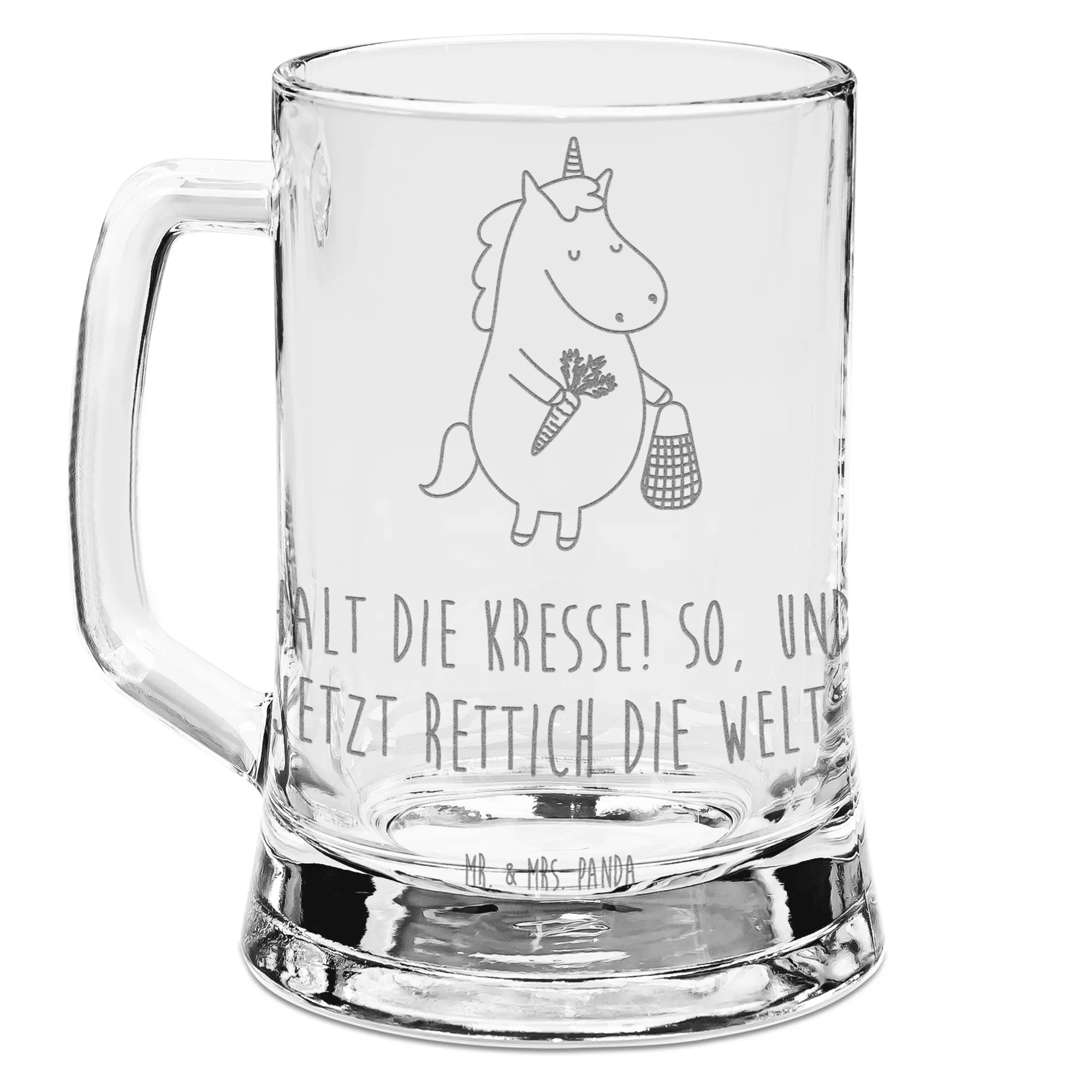 Entdecke den zauberhaften Gravur Bierkrug mit dem niedlichen Einhorn Gemüse-Motiv aus der Einhorn-Kollektion von Mr. & Mrs. Panda!