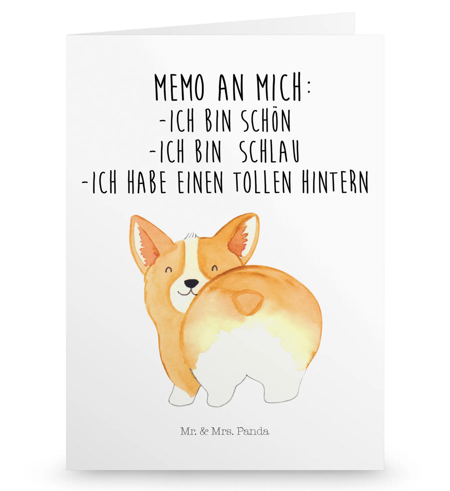 Du suchst nach dem perfekten Geschenk für einen Hunde-Liebhaber oder möchtest jemanden mit einem ganz besonderen Gruß aufmuntern? Dann ist die wunderschöne Grußkarte "Corgie Po" aus der Hunde Kollektion von Mr. & Mrs. Panda genau das Richtige für dich! Diese liebevolle Karte zeigt einen niedlichen Corgi, der fröhlich seinen Po in die Kamera hält – gleichzeitig ein niedlicher Anblick und eine gute Portion Motivation. Auf der Vorderseite findest du den Spruch: "Memo an mich: ich bin schön, ich bin schlau, ich habe einen tollen Hintern". Perfekt, um sich selbst eine kleine Freude zu machen oder einem lieben Menschen ein Lächeln ins Gesicht zu zaubern.