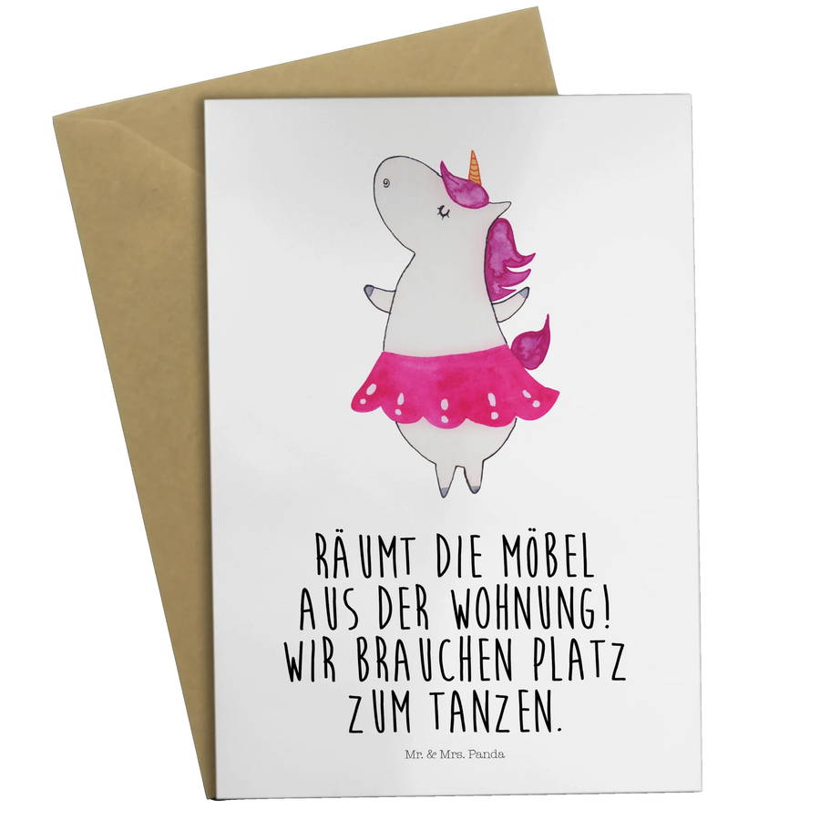 Die wundervolle Grußkarte "Einhorn Ballerina" aus der Einhorn-Kollektion von Mr. & Mrs. Panda ist das perfekte Geschenk für alle, die das Tanzen lieben. Dieses zauberhafte Einhorn in einem Tütü bringt Freude und Lebenslust in jeden Anlass! Ob du ein Geburtstagskind erfreuen oder einfach nur einen herzlichen Gruß verschicken möchtest – diese Karte trifft immer den richtigen Ton. Mit dem Slogan "Räumt die Möbel aus der Wohnung! Wir brauchen Platz zum Tanzen." spricht sie auf humorvolle Weise die Freude am Feiern und Tanzen an.