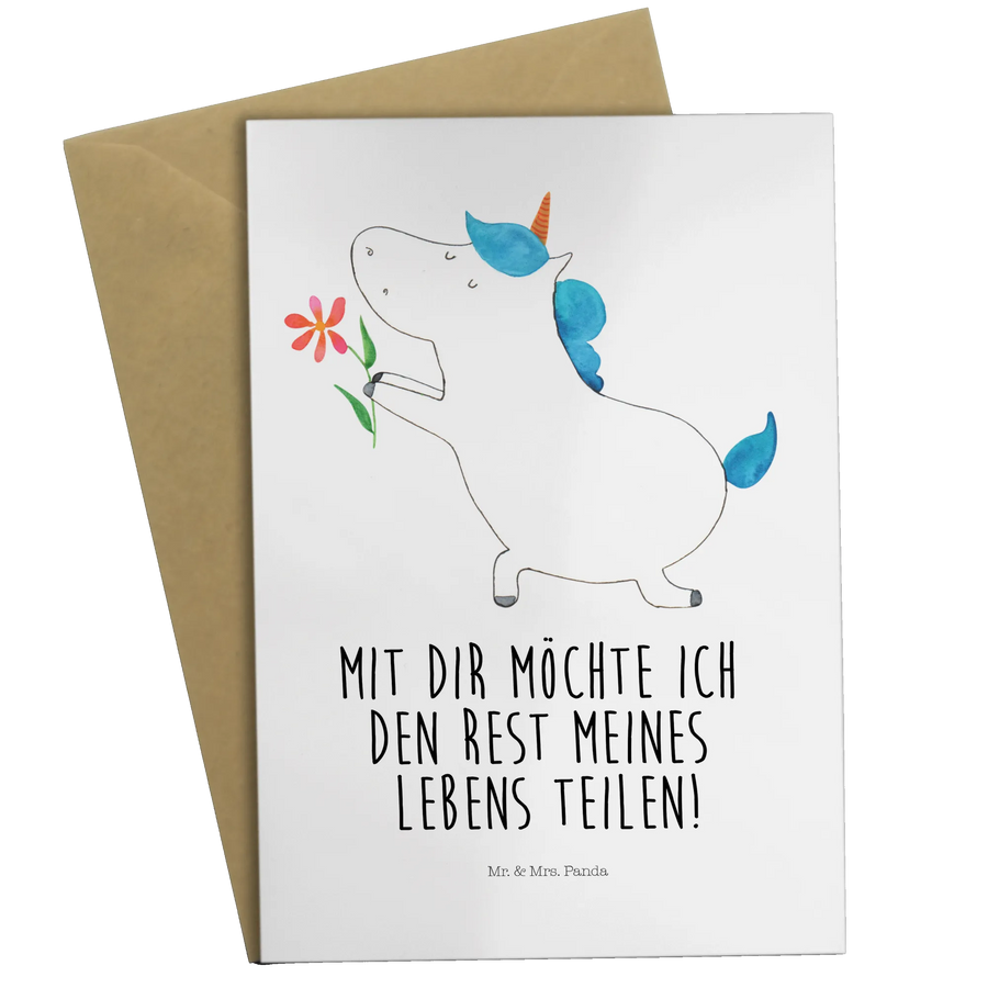 Die zauberhafte Grußkarte "Einhorn Blume" aus der Einhorn-Kollektion von Mr. & Mrs. Panda ist das ideale Geschenk für alle, die an besonderen Anlässen eine liebevolle Botschaft übermitteln möchten. Ob zur Hochzeit, zum Geburtstag oder einfach so für einen lieben Menschen – diese Karte bringt das Herz zum Schmelzen! Mit dem niedlichen Einhorn, das voller Liebe eine Blume überreicht, zaubert sie jedem ein Lächeln ins Gesicht. Das Motto "Mit dir möchte ich den Rest meines Lebens teilen!" spricht von wahrer Liebe und tiefem Glück – perfekt, um deinem Partner oder deiner Partnerin zu zeigen, wie viel er oder sie dir bedeutet.