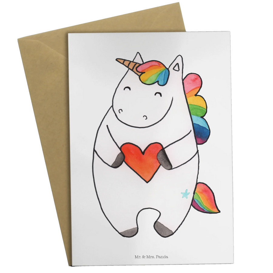 Diese wunderschöne Grußkarte von Mr. & Mrs. Panda ist das perfekte Geschenk für jeden Einhorn-Fan! Das bezaubernde Motiv mit dem Einhorn Herz zieht sofort alle Blicke auf sich und verbreitet gute Laune. Ideal für besondere Anlässe wie Geburtstage, Hochzeiten oder einfach nur um jemandem eine Freude zu machen.