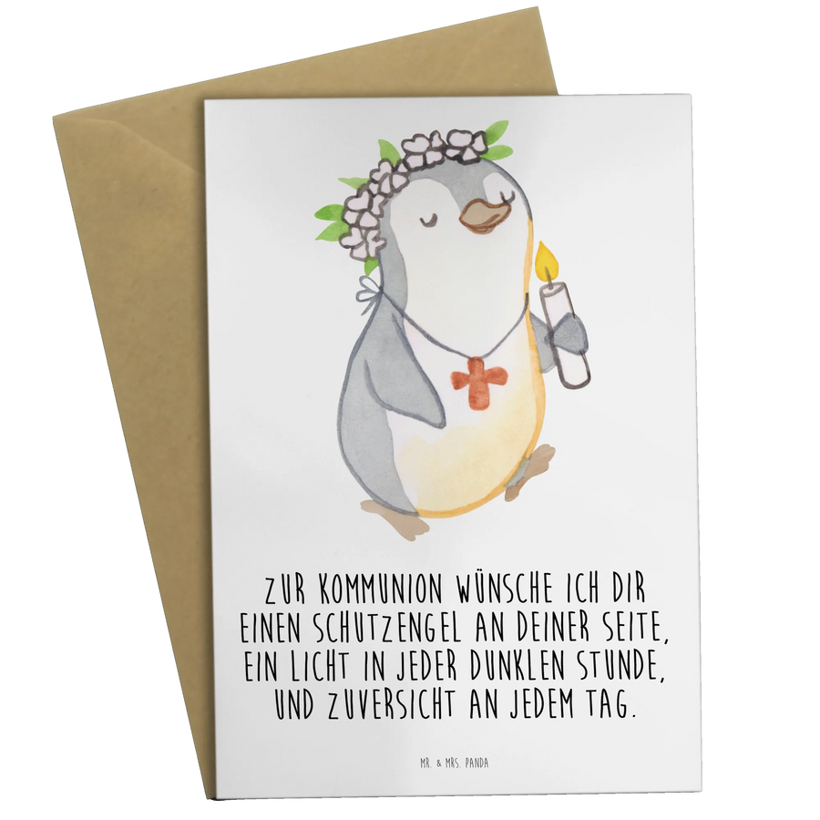 Die Grußkarte 'Pinguin Kommunion Mädchen' von Mr. & Mrs. Panda ist der perfekte Begleiter für wichtige Anlässe wie die Kommunion oder die Konfirmation.