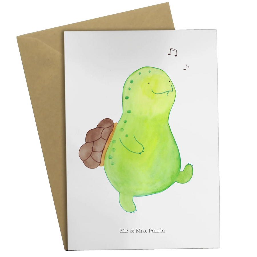 Die fröhliche Grußkarte mit dem süßen Motiv der pfeifenden Schildkröte von Mr. & Mrs. Panda ist das perfekte Geschenk für viele Gelegenheiten! Hast du schon mal gesehen, wie eine Schildkröte pfeift? Nein? Dann ist diese Karte genau das Richtige!