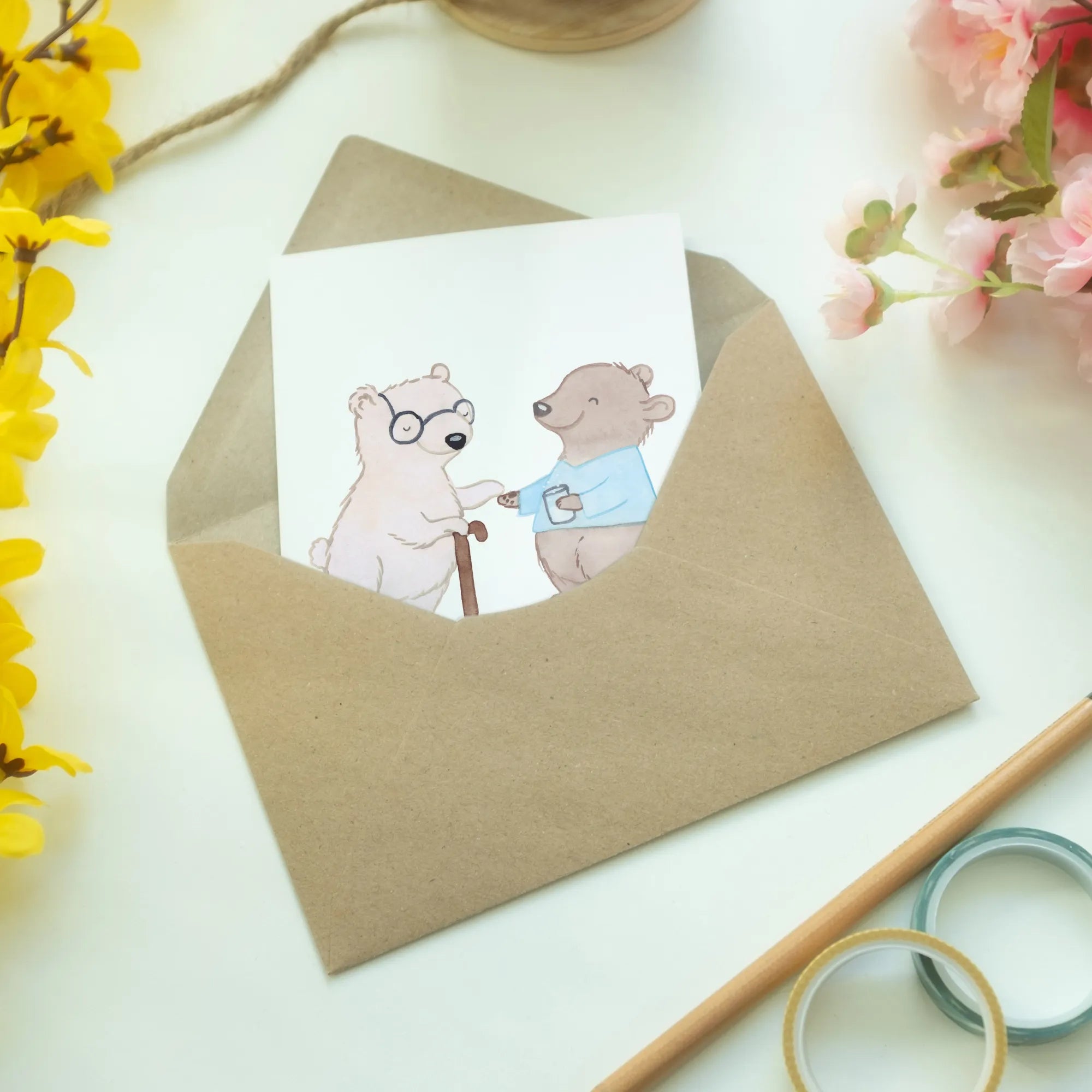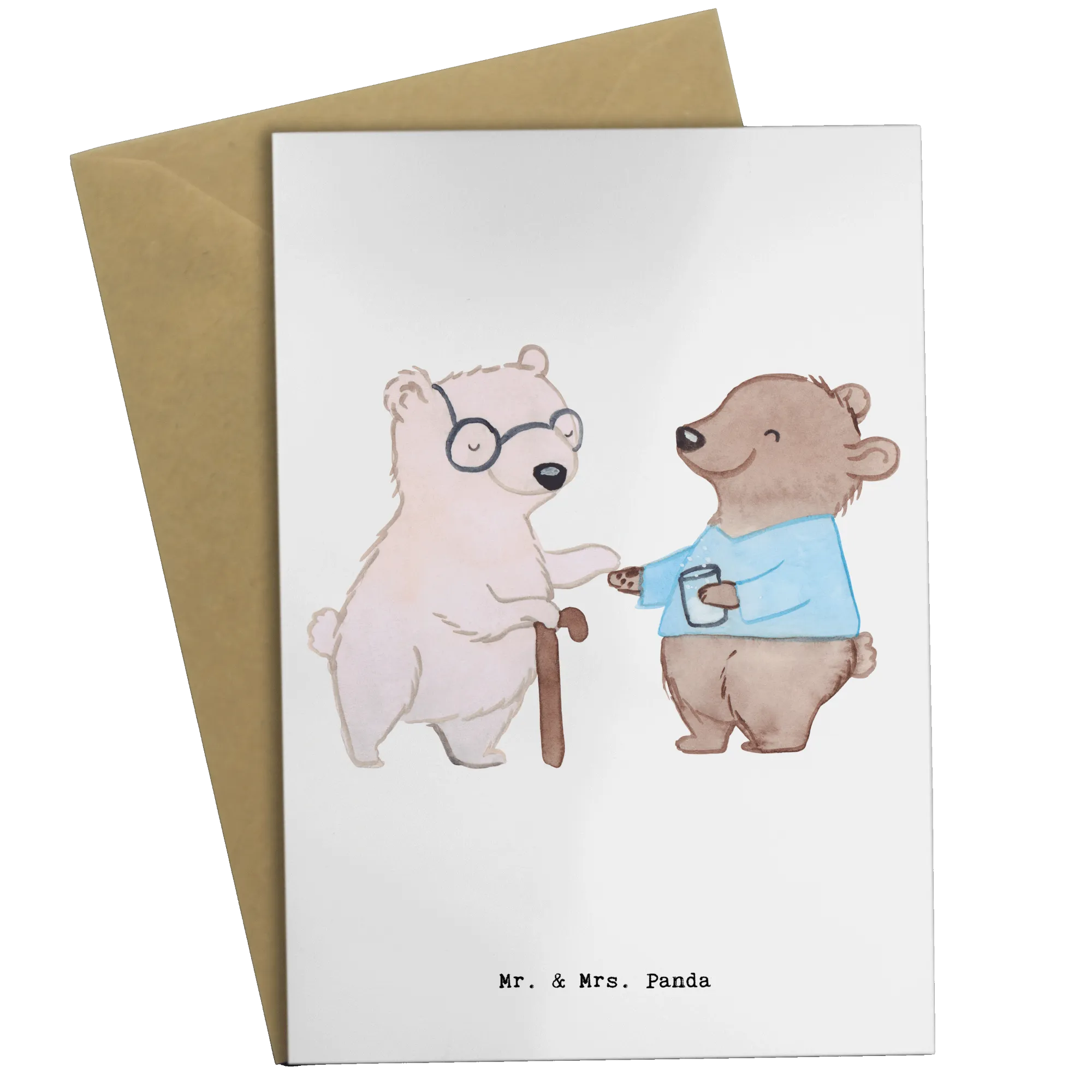 Die Grußkarte "Altenpfleger mit Herz" aus der einzigartigen Berufe-Kollektion von Mr. & Mrs. Panda ist der perfekte Begleiter für alle, die lieben, danken und Freude bereiten möchten. Diese liebevoll gestaltete Karte zeigt einen süßen Altenpfleger-Bären, der einem älteren Bären seine Unterstützung anbietet. Damit drückst du ideal aus, wie wichtig pflegerische Berufe sind und das sie mehr Wertschätzung verdienen!