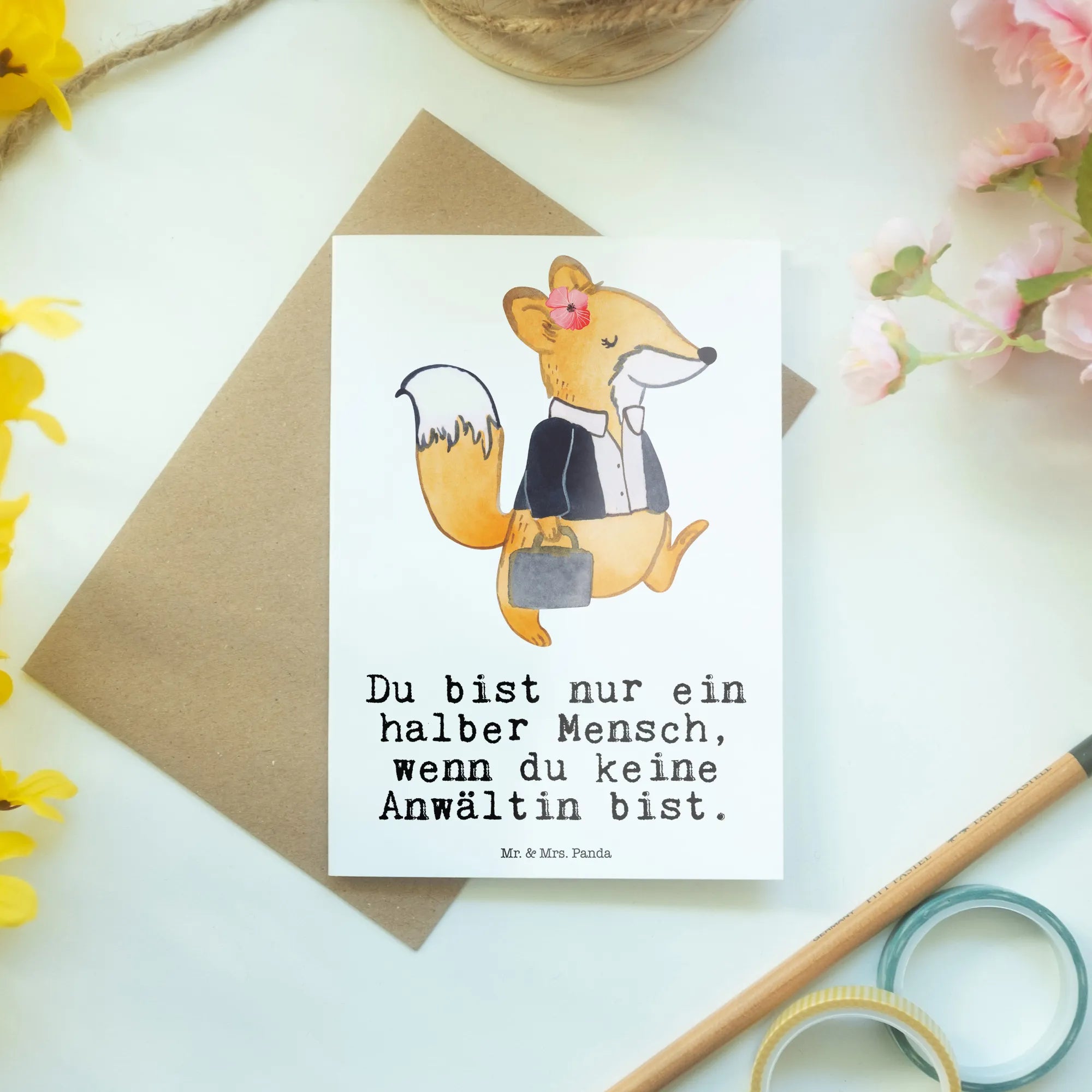 Diese Grußkarte "Anwältin mit Herz" von Mr. & Mrs. Panda ist das ideale Geschenk für all jene, die gerade das Staatsexamen bestanden haben oder sich in der Anwaltskanzlei engagieren. Mit dem Slogan "Du bist nur ein halber Mensch, wenn du keine Anwältin bist" vermittelt sie eine liebevolle Botschaft, die die Empfängerin zum Schmunzeln bringt.