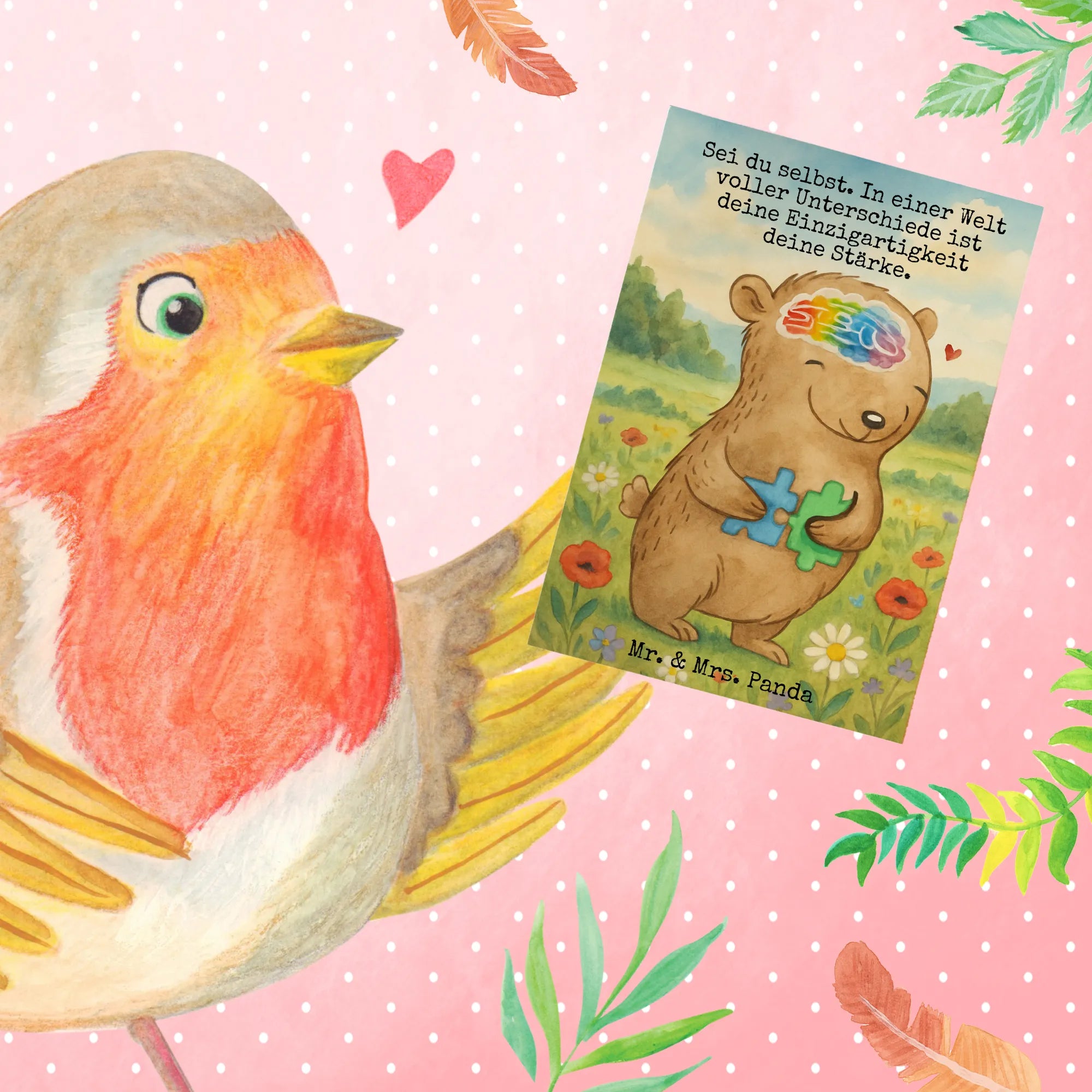 Die Grußkarte „Bär Autismus“ aus der Kollektion Tiere mit Superkräften zeigt einen Bären, der ein Puzzleteil hält und versucht, es zu verbinden. Das Gehirn als Puzzle visualisiert auf einfühlsame Weise das Thema Autismus. Auf der Karte steht der Slogan: „Sei du selbst. In einer Welt voller Unterschiede ist deine Einzigartigkeit deine Stärke.“ Diese Botschaft ist klar, respektvoll und ermutigend.