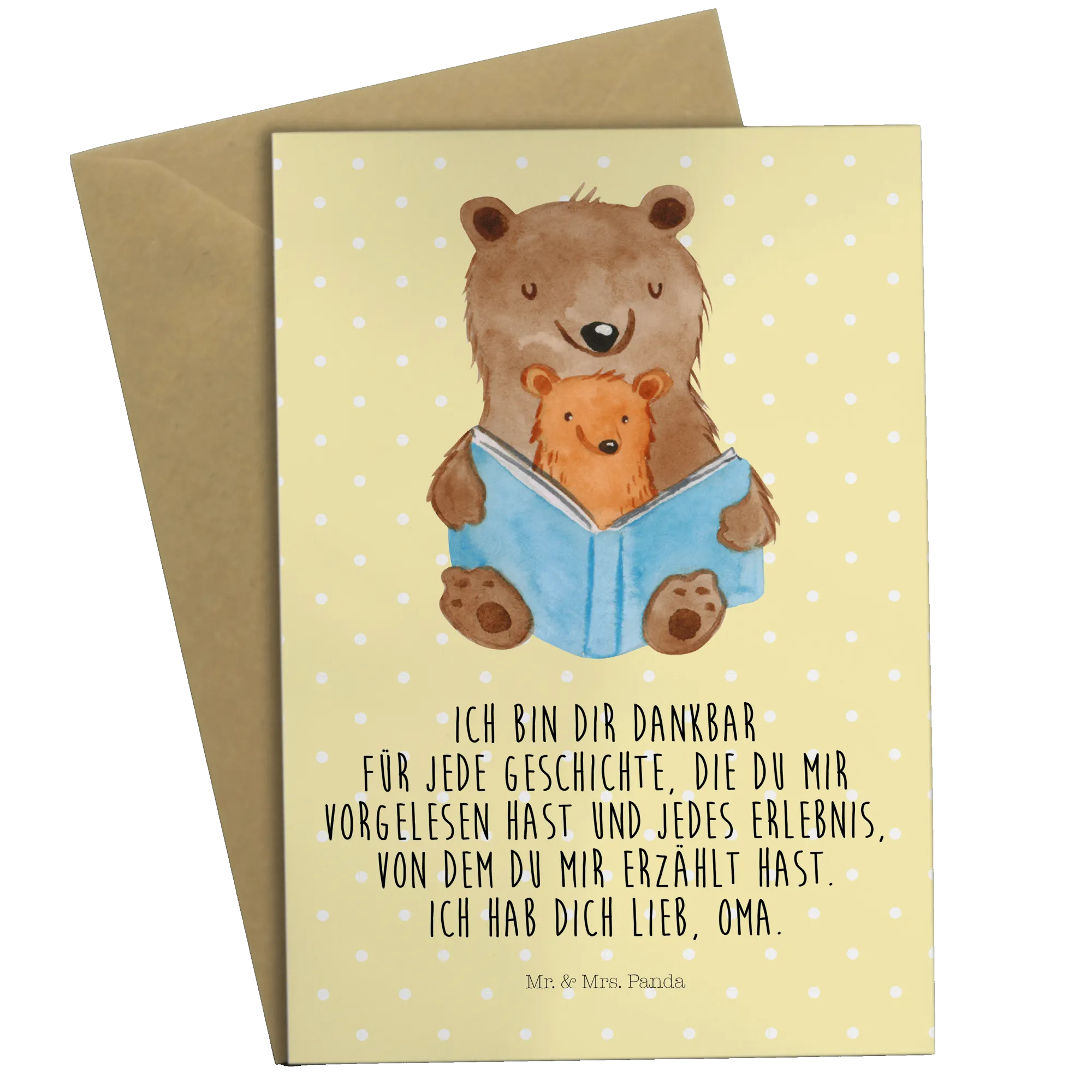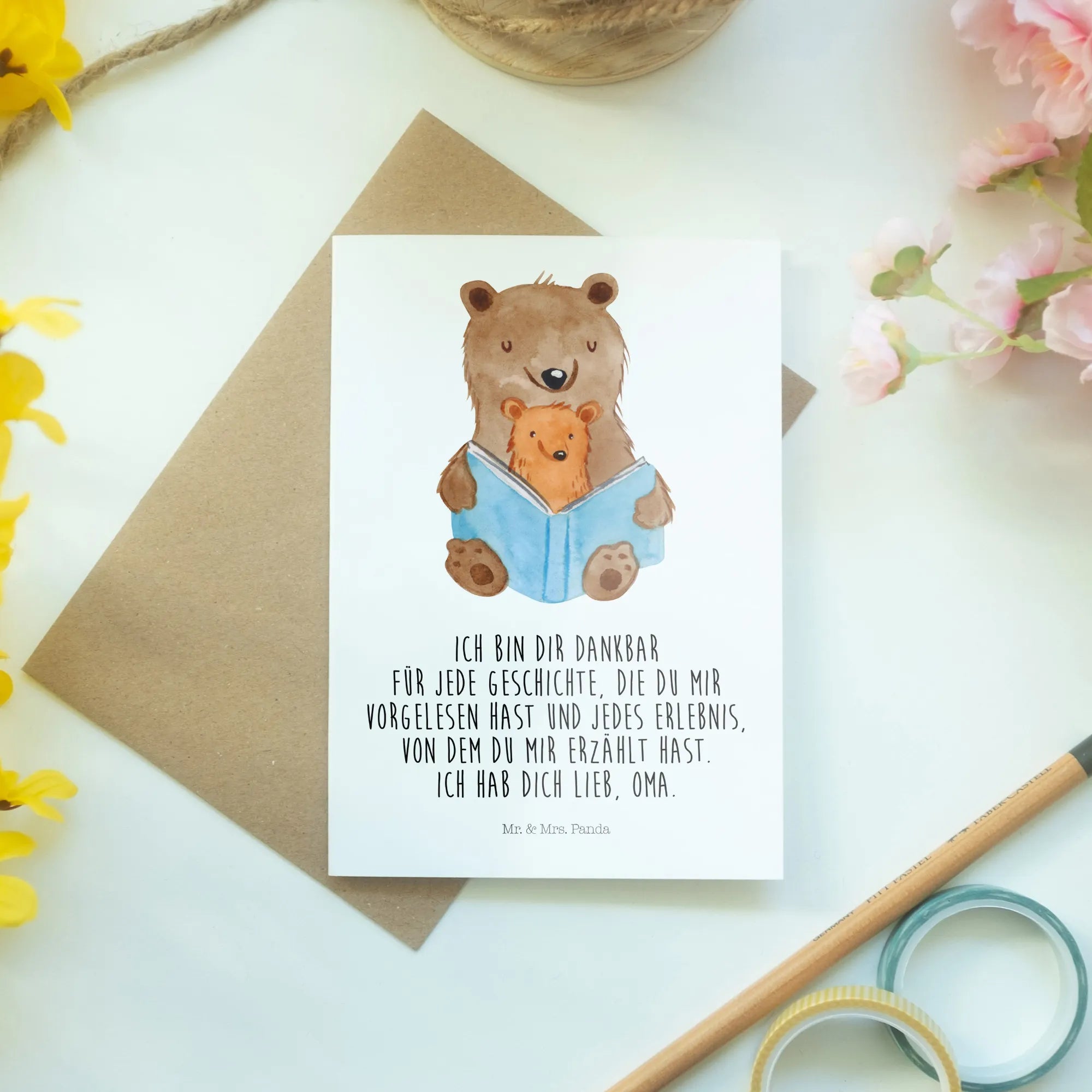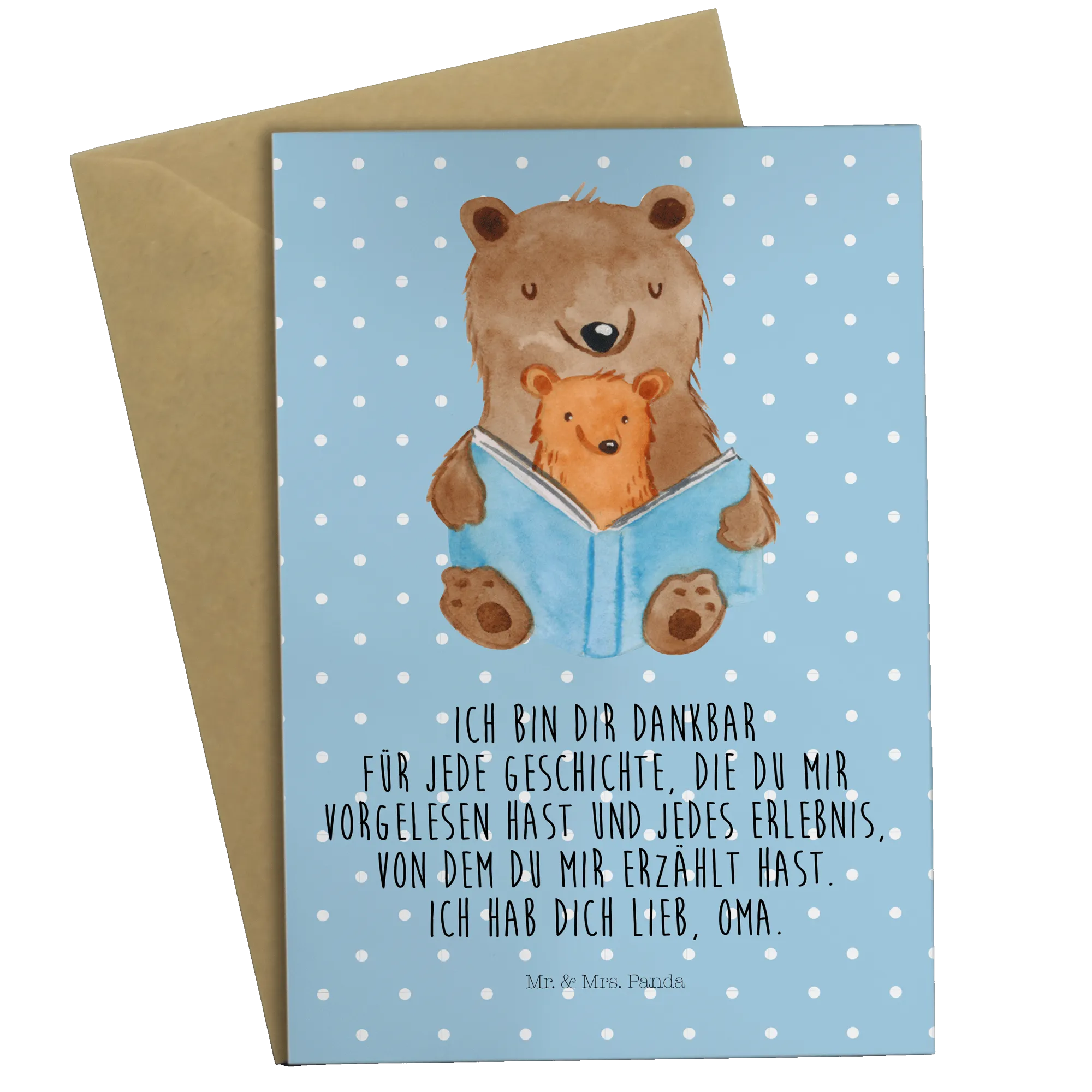 Die Grußkarte mit dem niedlichen Motiv "Bären Buch" von Mr. & Mrs. Panda ist das perfekte Geschenk für alle, die ihrer Oma oder einem anderen geliebten Familienmitglied eine Freude bereiten möchten.
