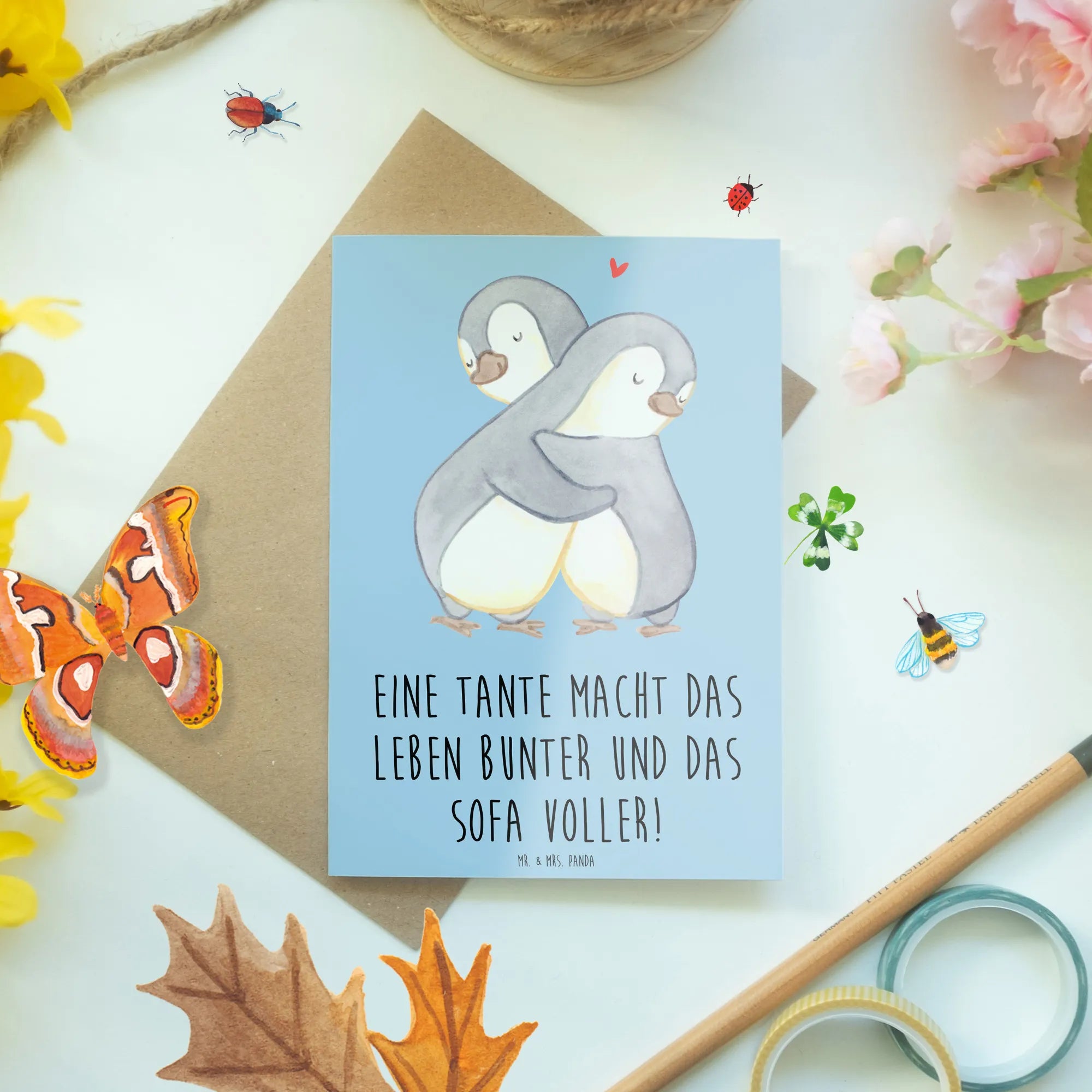 Diese einzigartige Grußkarte von Mr. & Mrs. Panda zeigt das liebevolle Motiv einer Tante und wird deine Verwandten begeistern! Tanten sind oft mehr als nur Verwandte – sie sind Vertraute, Freundinnen und eine Quelle der Inspiration im Leben.
