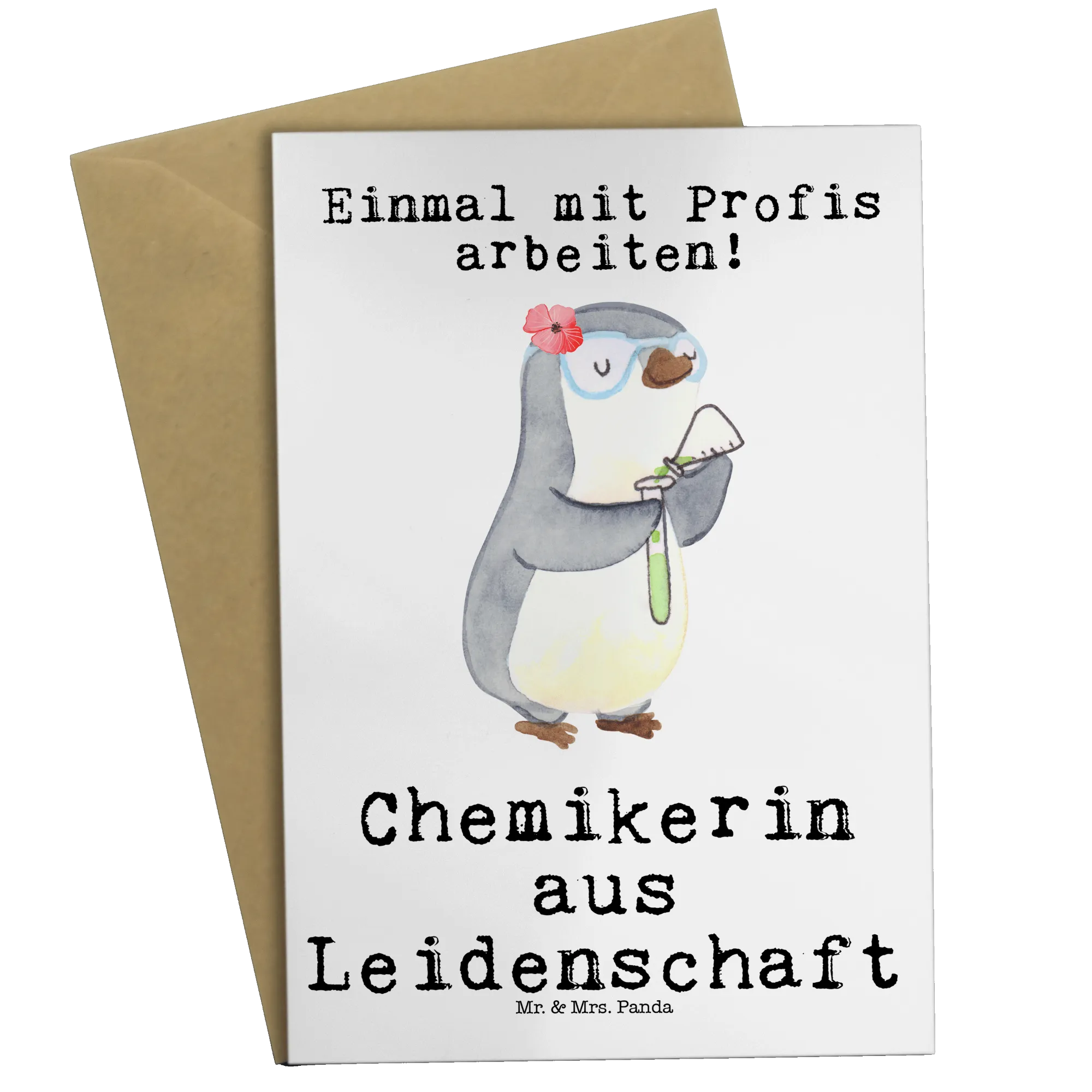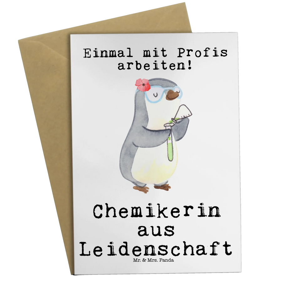 Die Grußkarte "Chemikerin aus Leidenschaft" von Mr. & Mrs. Panda ist das perfekte Geschenk für jede Chemikerin, Chemielaborantin oder Naturwissenschaftlerin in deinem Leben. Egal, ob zum Geburtstag, zur Hochzeit, als Einladungskarte oder einfach nur, um eine liebe Nachricht zu übermitteln – diese Karte ist immer eine gute Wahl. Das süße Motiv, ein niedlicher Pinguin mit Reagenzglas, verkörpert die Leidenschaft für die Chemie und macht diese Karte einzigartig.