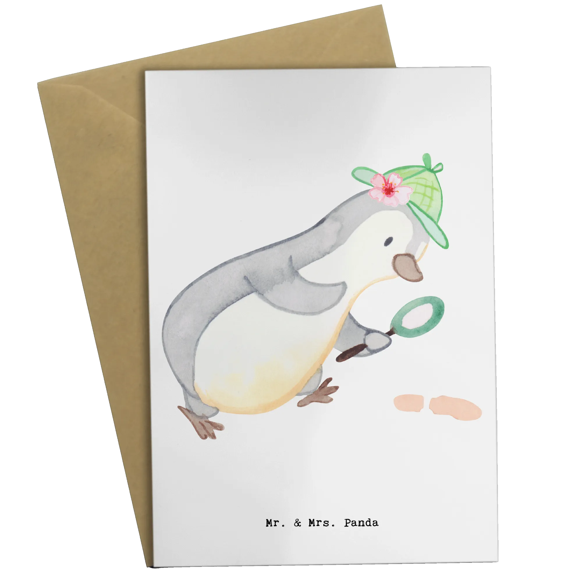 Die Grußkarte "Detektivin mit Herz" aus der einzigartigen Berufe-Kollektion von Mr. & Mrs. Panda ist das perfekte Geschenk für angehende Detektivinnen oder leidenschaftliche Ermittlerinnen! Diese liebevoll gestaltete Karte bringt nicht nur ein Lächeln ins Gesicht, sondern vermittelt auch, wie wichtig und spannend der Beruf der Detektivin ist.