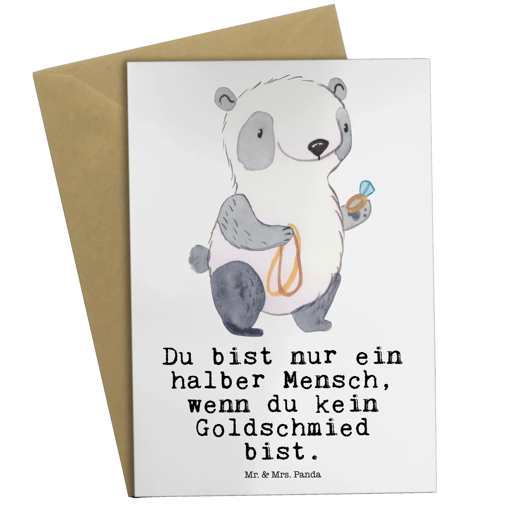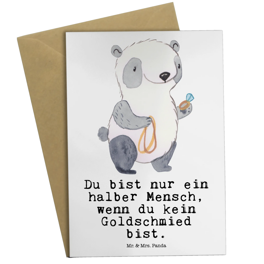 Die Grußkarte "Goldschmied mit Herz" von Mr. & Mrs. Panda ist das perfekte Geschenk für alle, die in der Schmuckbranche arbeiten oder eine Leidenschaft für Schmuck und dessen Gestaltung haben. Mit ihrem süßen Motiv und dem witzigen Slogan "Du bist nur ein halber Mensch, wenn du kein Goldschmied bist" spricht diese Karte direkt das Herz eines jeden Goldschmieds an. Sie eignet sich hervorragend für verschiedene Anlässe, sei es zur Eröffnung eines Schmuckgeschäftes, zum Berufsabschluss oder einfach, um einem Kollegen zu danken.