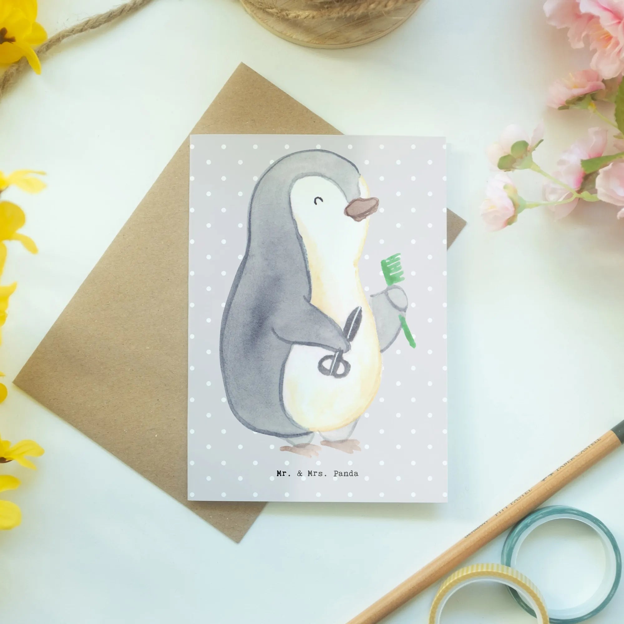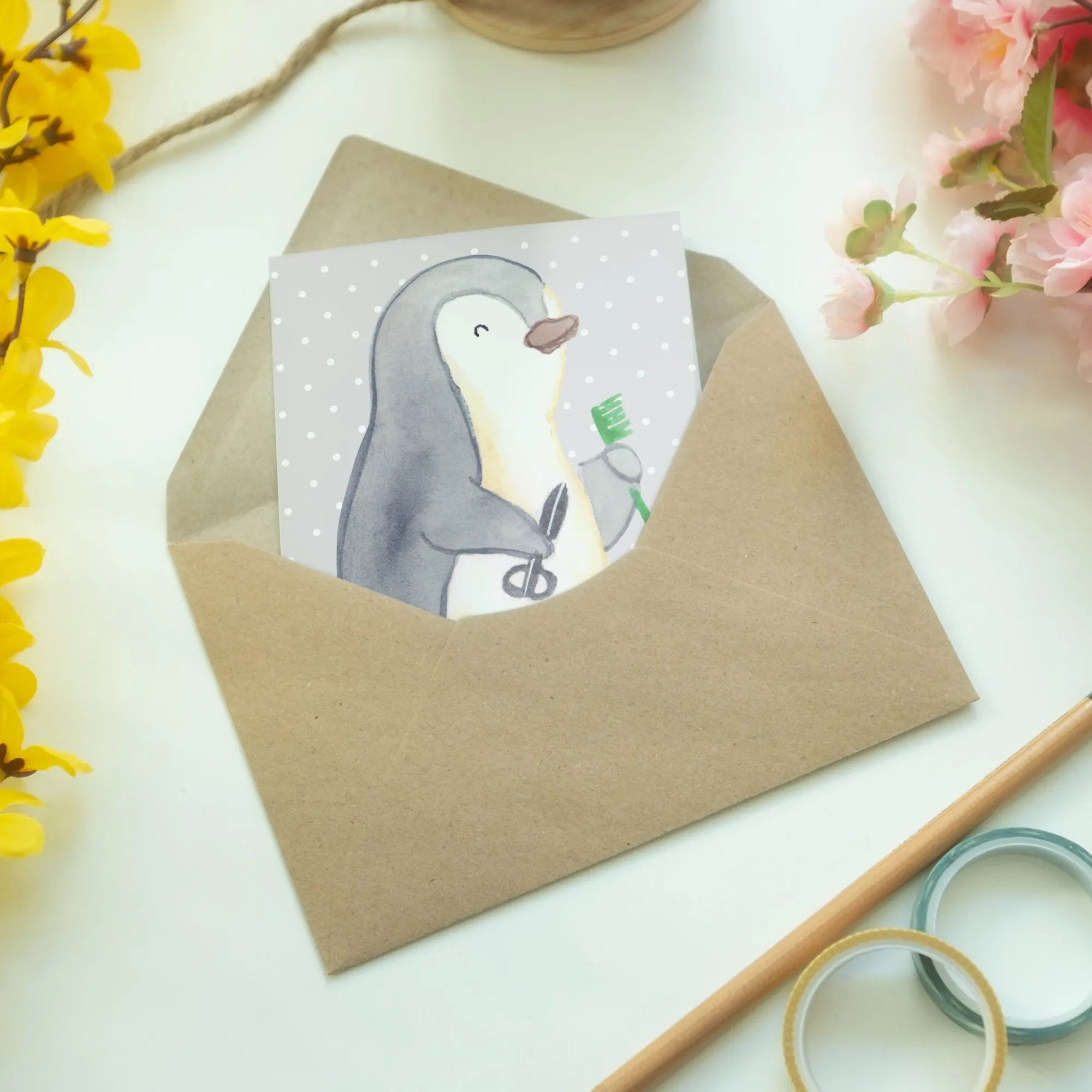 Diese einzigartige Grußkarte, bedruckt auf hochwertigem 300-Gramm-Papier, verbindet einen niedlichen Pinguin mit einem Kamm in der Hand und zeigt, wie viel Herzblut in der Hairstylist-Arbeit steckt. Die Karte hat eine elegante, hochglänzende Vorderseite und eine matte Innenseite, die sich hervorragend zum individuellen Beschriften eignet.