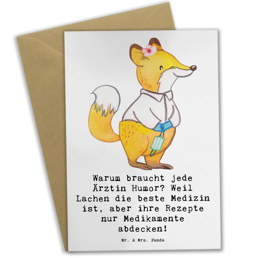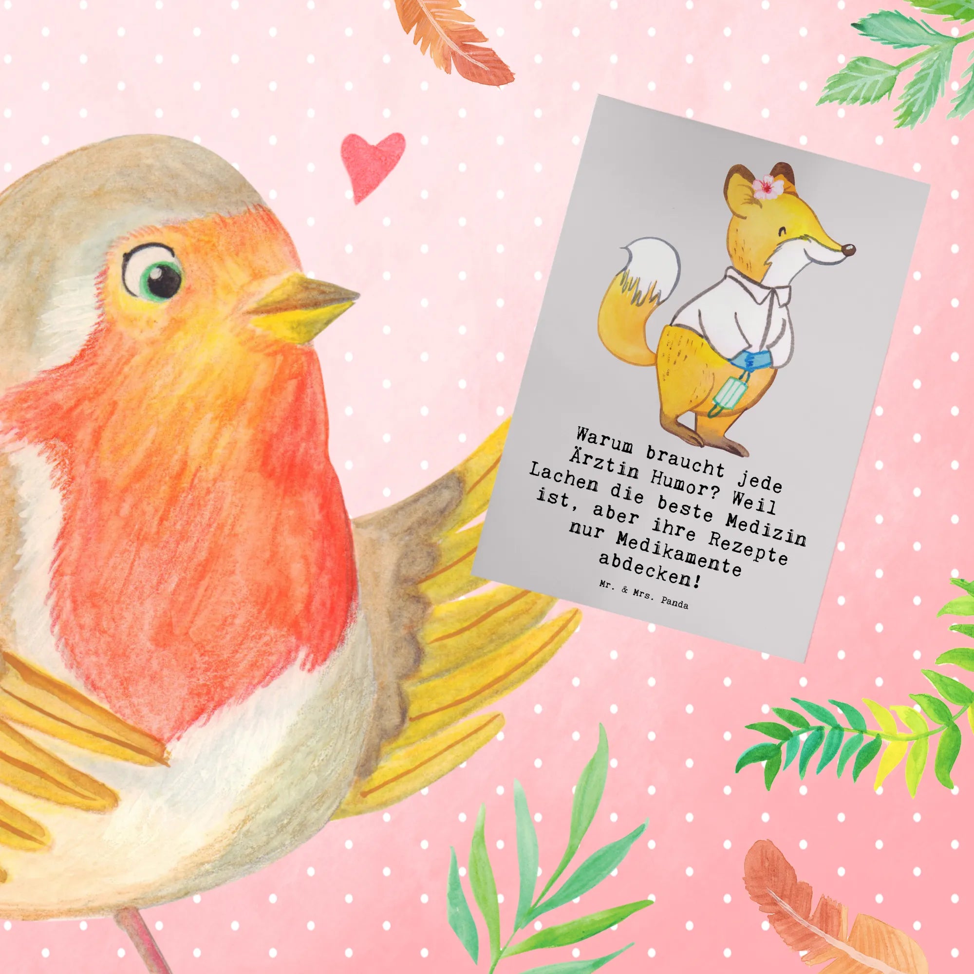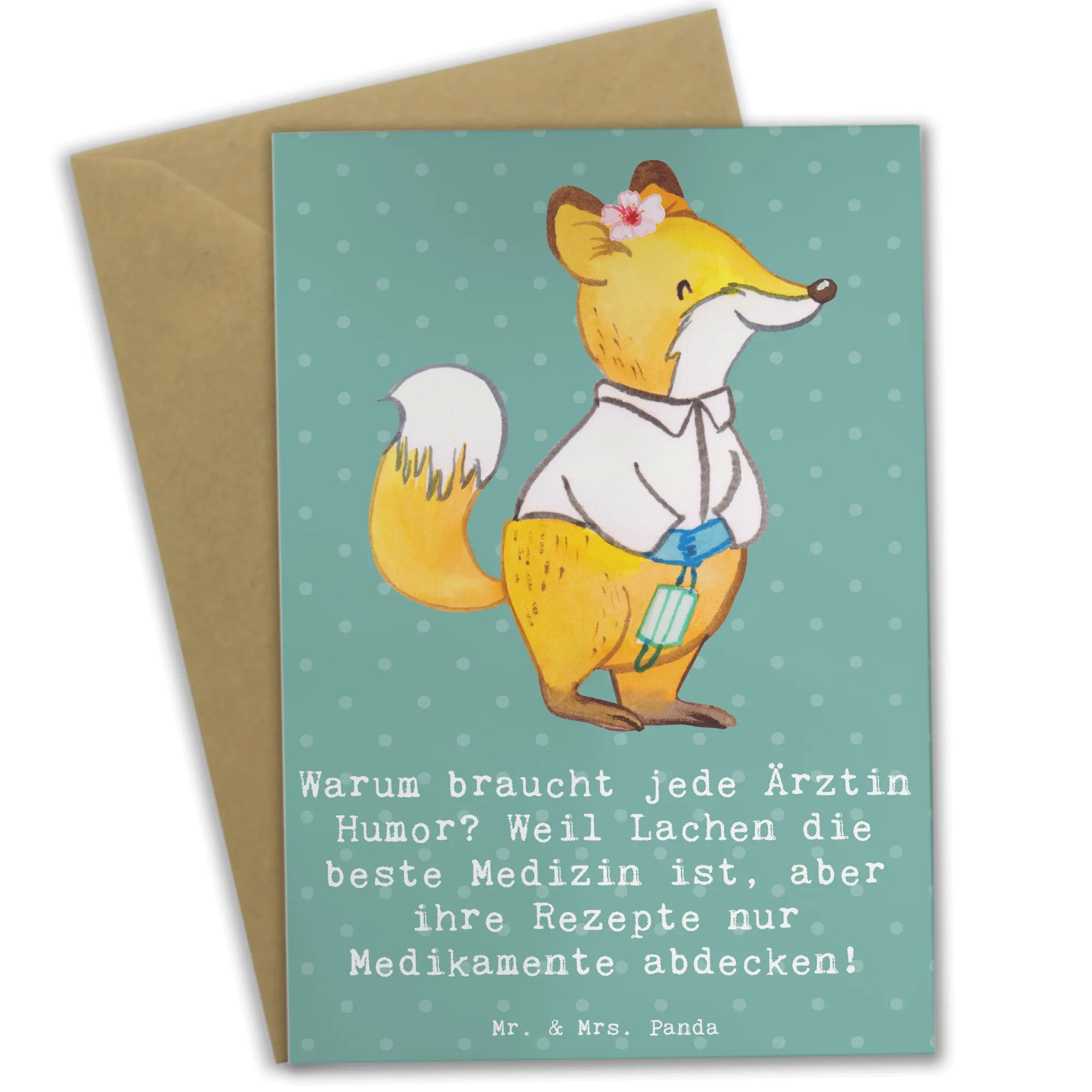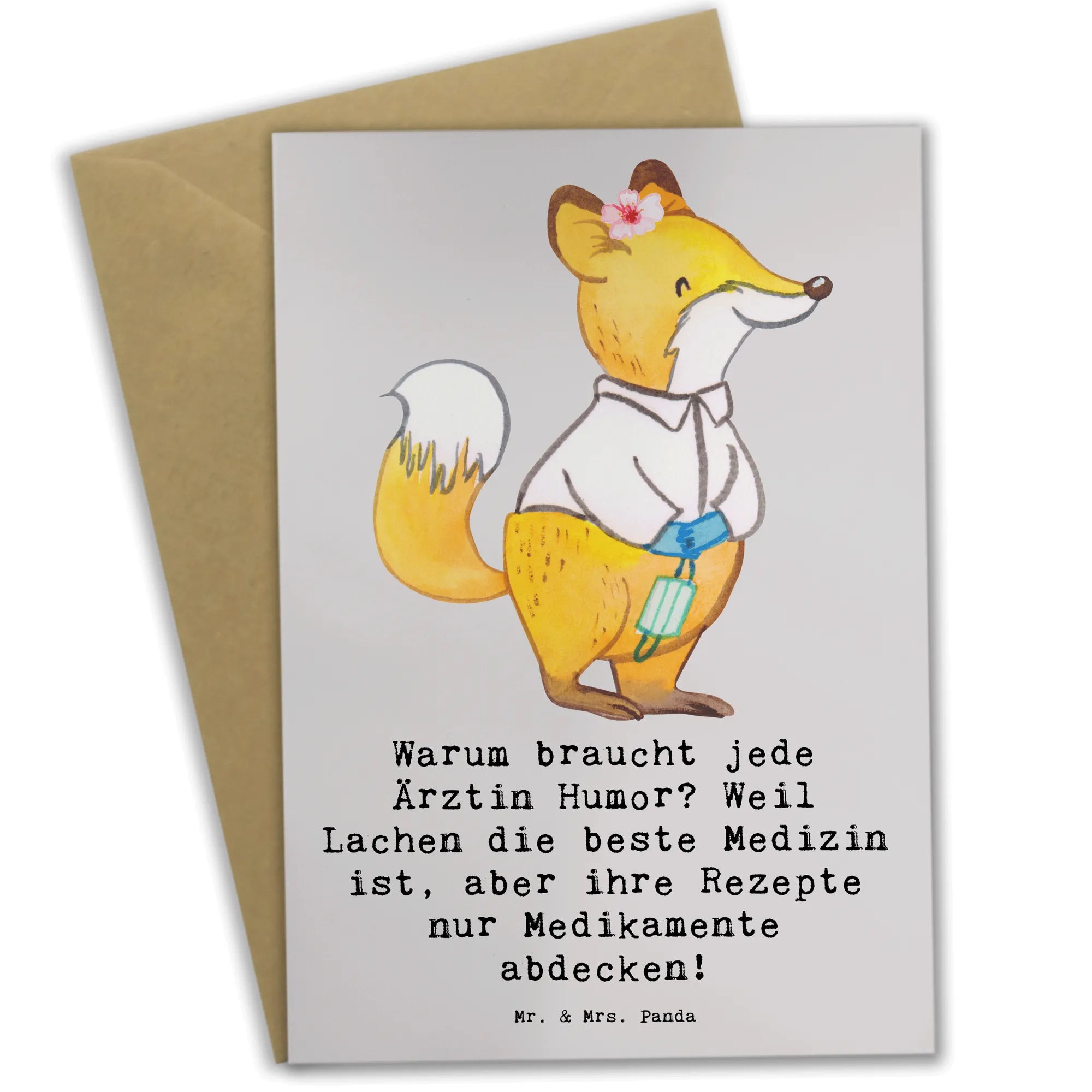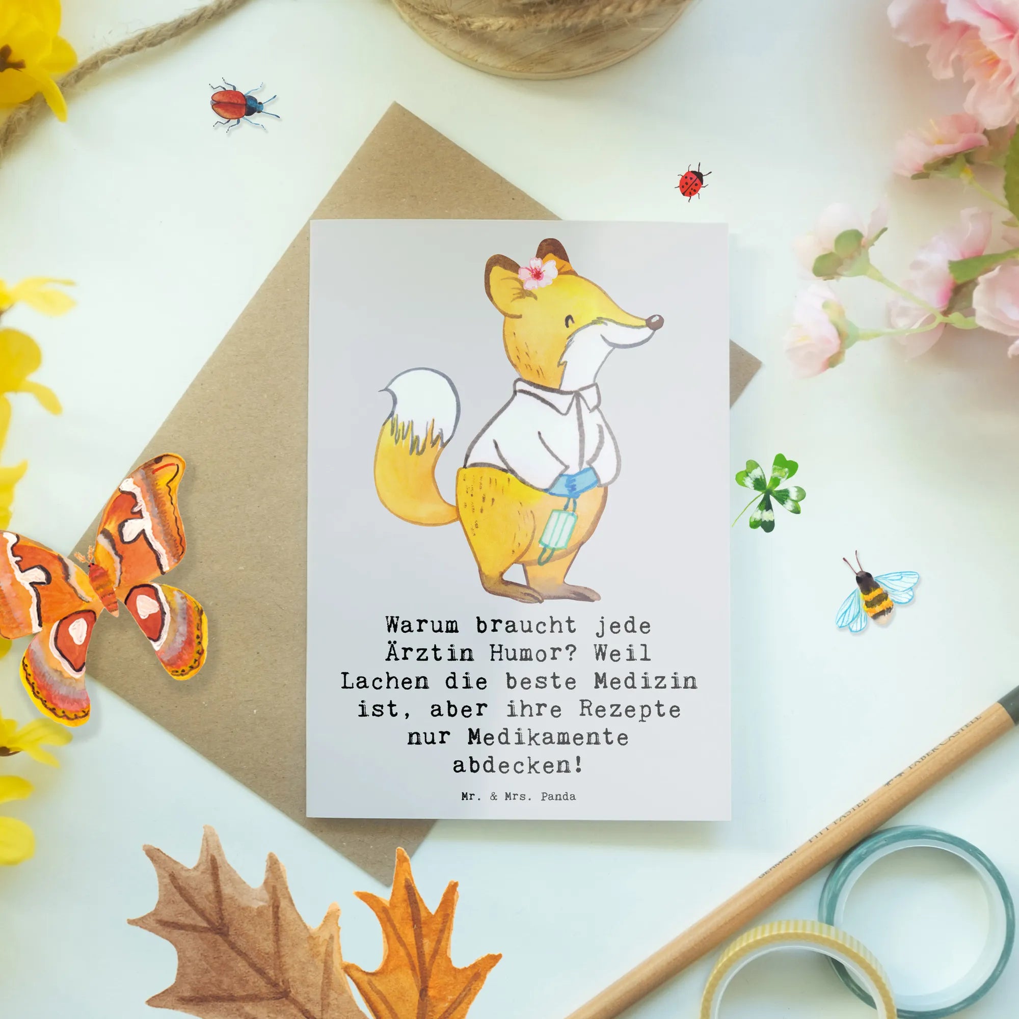 Die Grußkarte "Ärztin" aus der fantastischen Berufe-Kollektion von Mr. & Mrs. Panda ist das perfekte Geschenk für alle, die mit Leidenschaft ihren Beruf ausüben. Diese liebevoll gestaltete Karte zeigt humorvolle Motive und einen witzigen Spruch: "Warum braucht jede Ärztin Humor? Weil Lachen die beste Medizin ist, aber ihre Rezepte nur Medikamente abdecken!" Mit einem Maß von 148 mm x 105 mm ist sie ideal als Glückwunschkarte oder Einladungskarte für zahlreiche Anlässe.
