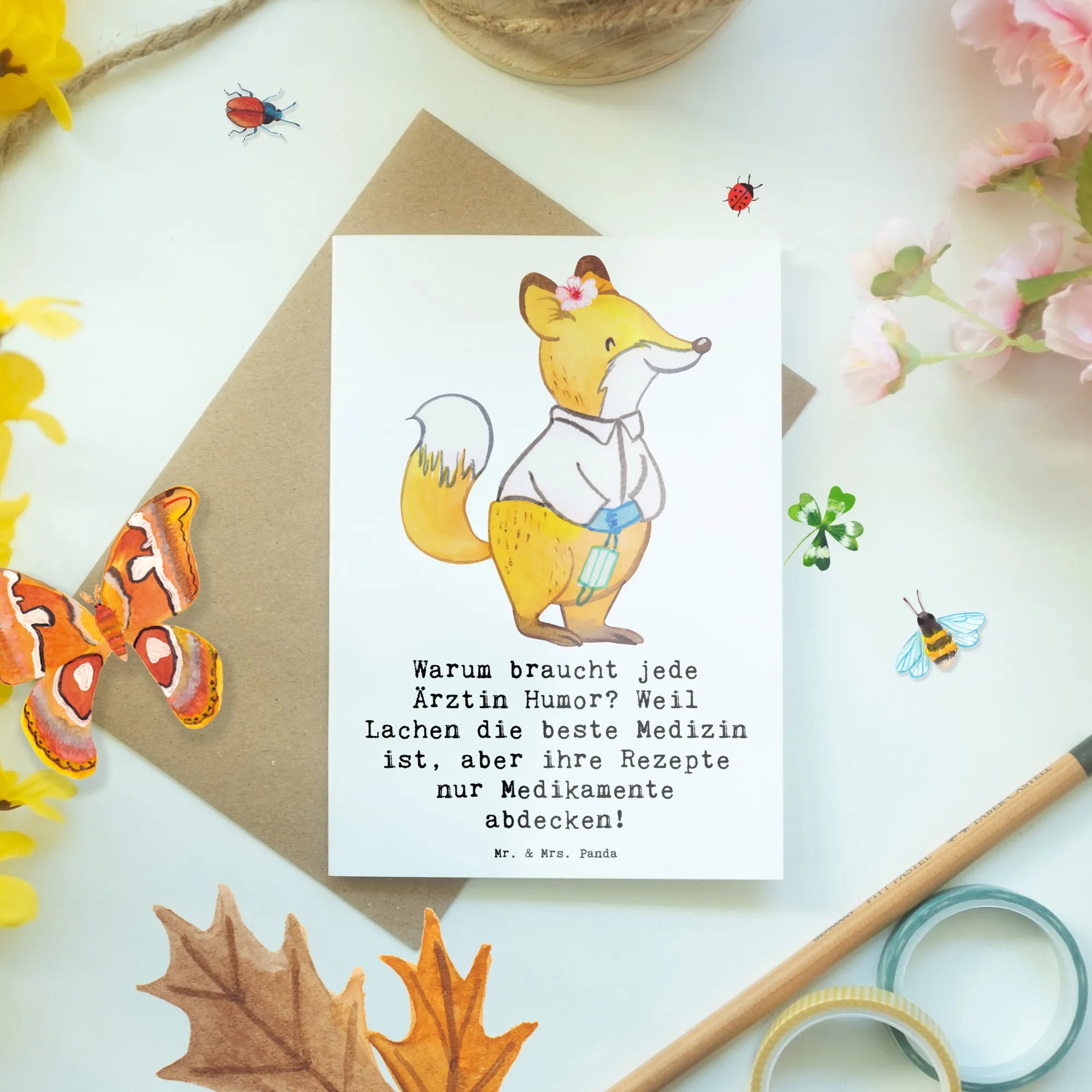 Auf der Vorderseite der Karte findest du den liebevollen Spruch: "Warum braucht jede Ärztin Humor? Weil Lachen die beste Medizin ist, aber ihre Rezepte nur Medikamente abdecken!" Dieser humorvolle Text bringt nicht nur ein Lächeln, sondern erinnert auch daran, wie wichtig es ist, in stressigen Zeiten zu lachen.