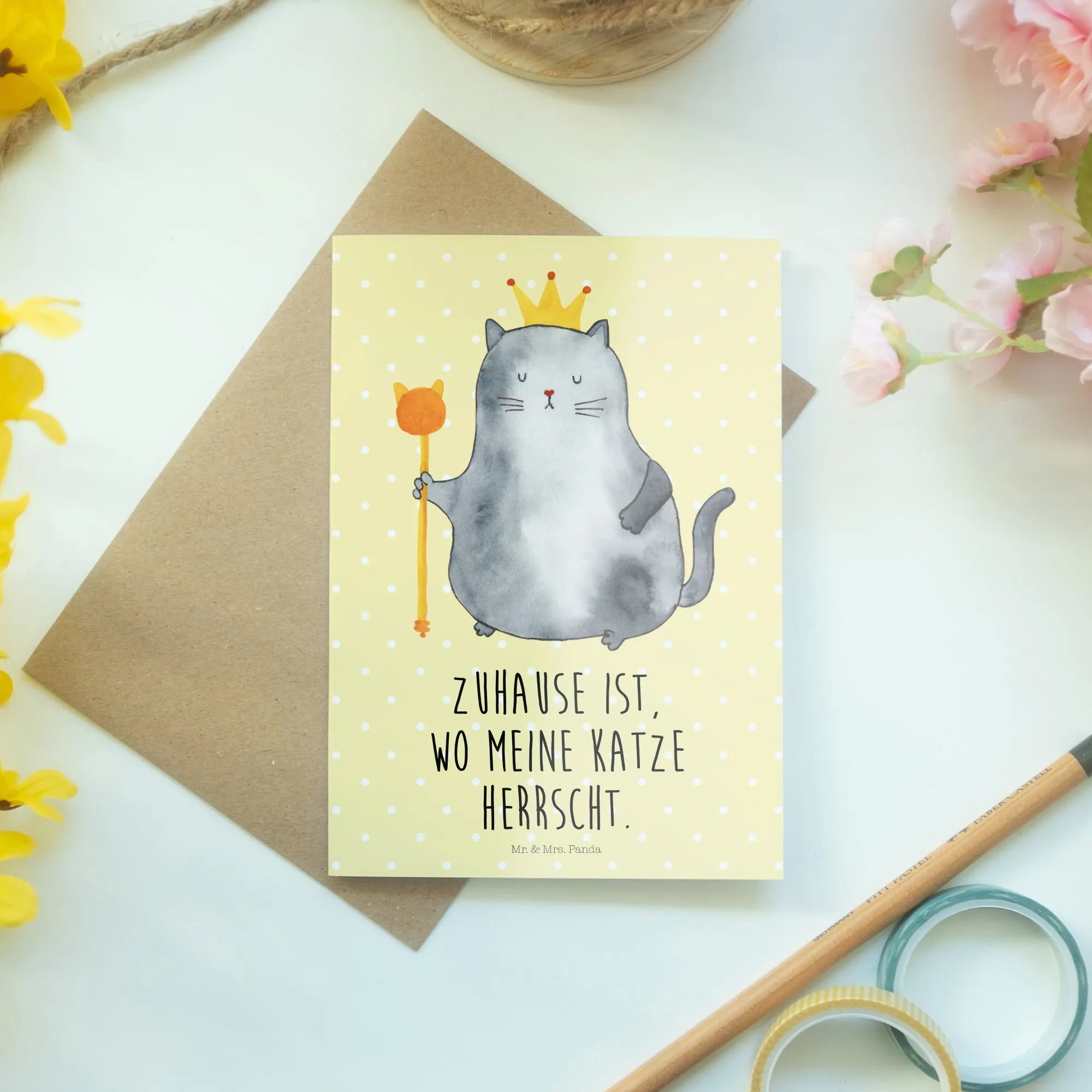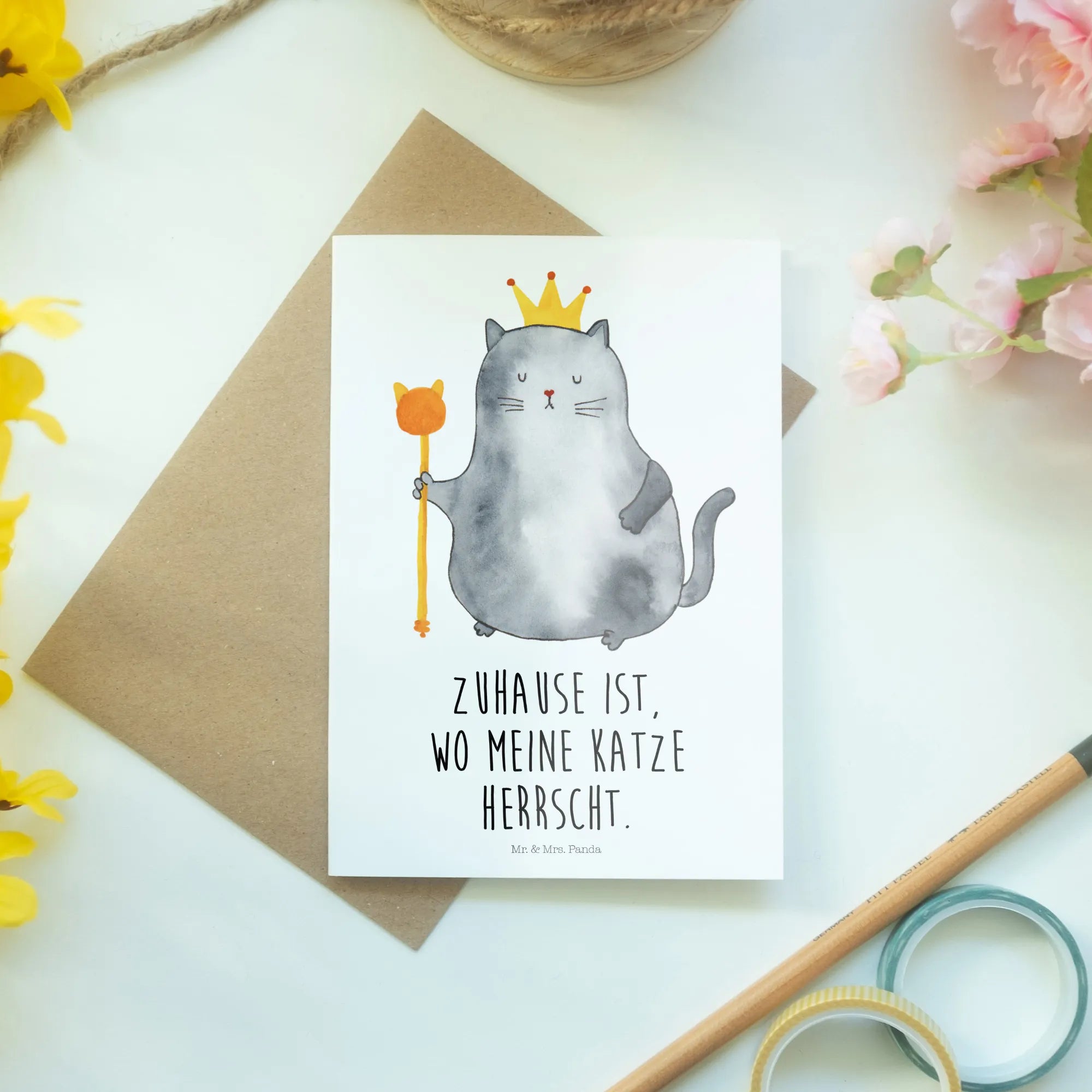 Die Grußkarte "Katzen König" aus der zauberhaften Katzen-Kollektion von Mr. & Mrs. Panda ist das perfekte Geschenk für alle Katzenliebhaber und -freunde. Mit einer stolzen Katze, die eine Krone trägt, bringt diese Karte nicht nur Glückwünsche, sondern auch ein Lächeln auf jedes Gesicht. Der Spruch "Zuhause ist, wo meine Katze herrscht" spricht jedem Katzenbesitzer aus der Seele und macht die Karte zu einem idealen Begleiter für feierliche Anlässe.