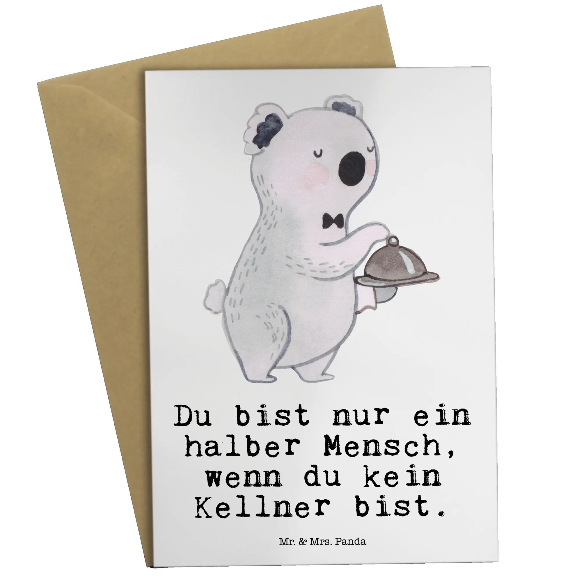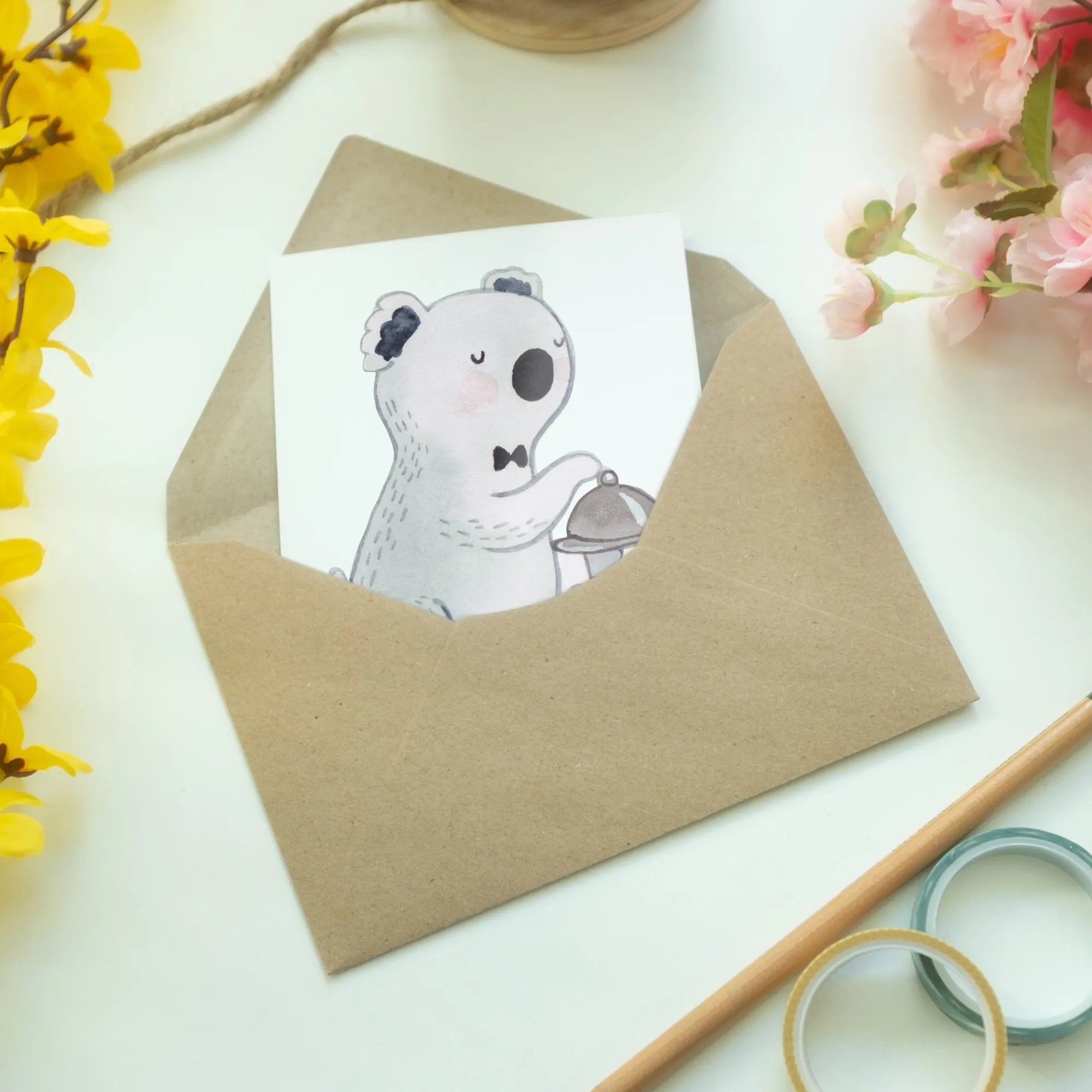 Mit einem liebevoll handgezeichneten Motiv eines kleinen Koalas, der köstliche Speisen serviert, bringt die Karte ein Lächeln auf die Lippen und würdigt die besonderen Fähigkeiten jedes Kellners. Das Motto "Du bist nur ein halber Mensch, wenn du kein Kellner bist" könnte passend sein, um die Wertschätzung für diesen Beruf auszudrücken.