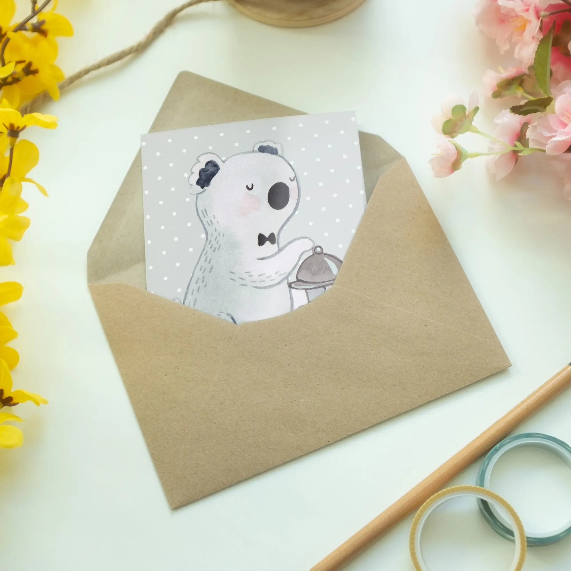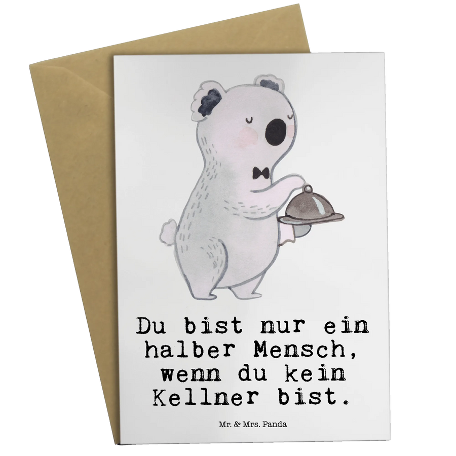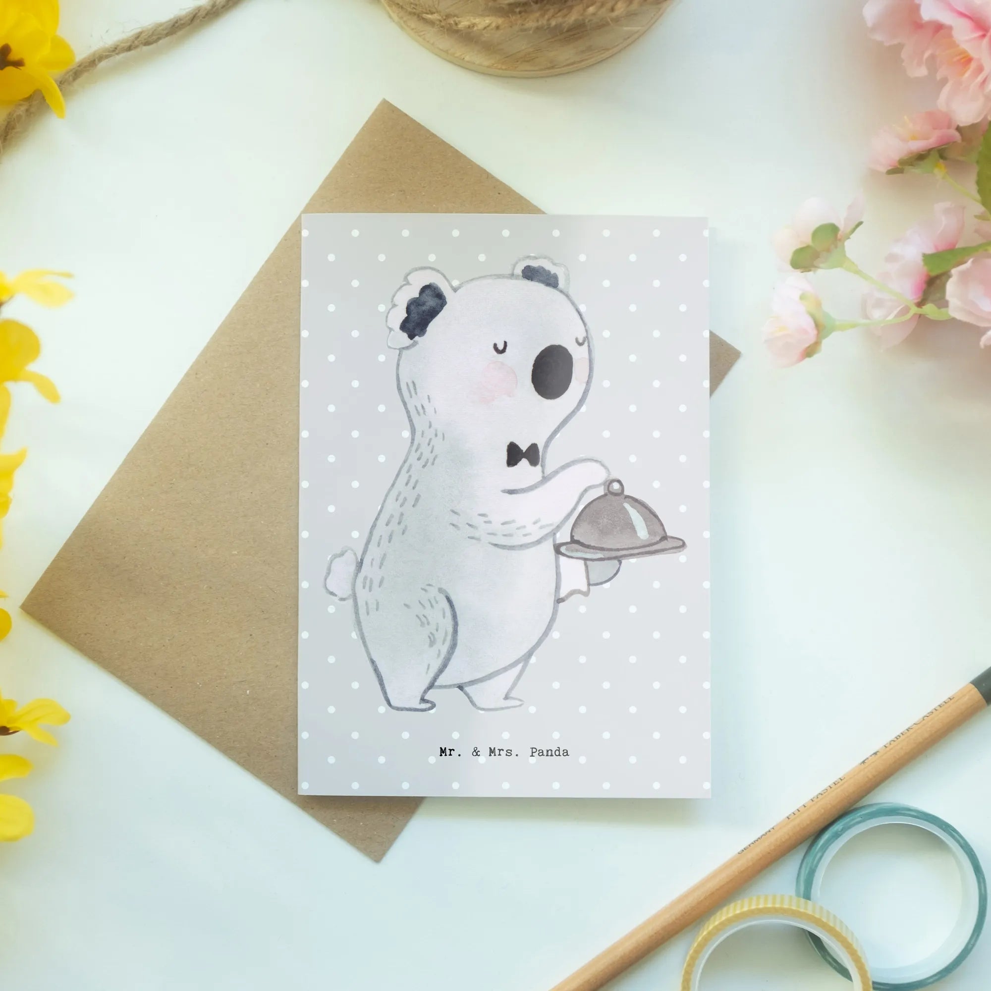 Jede Karte wird mit viel Liebe und Kreativität von Mr. & Mrs. Panda designed, und das süße Motiv mit dem Kellner, der mit Herz für seine Gäste da ist, wird jeden Empfänger erfreuen.