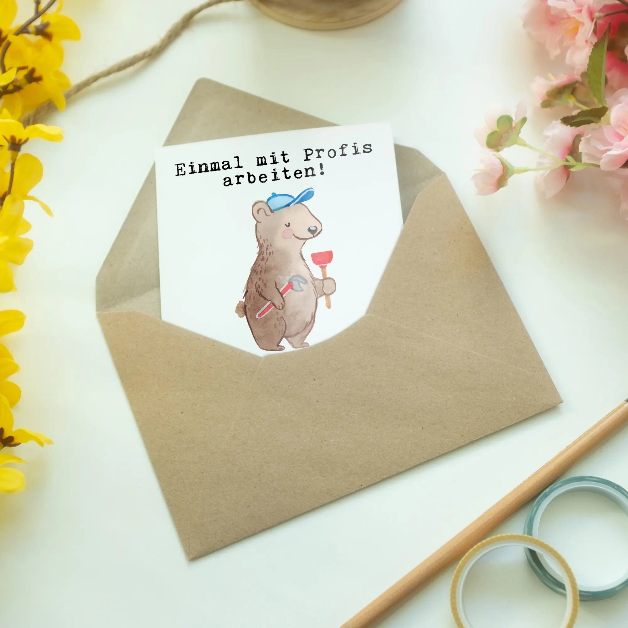 Grußkarte "Klempner aus Leidenschaft" von Mr. & Mrs. Panda – die liebevolle Karte für alle Handwerker, Installateure und Klempner, die ihren Beruf mit Herz und Humor leben. Unser süßer Bär mit Pümpel und Zange bringt ein Lächeln auf jedes Gesicht und passt perfekt zu Anlässen wie Gesellenprüfung, Ausbildungsabschluss, Jubiläum im Fachbetrieb, Abschied, Rente oder als Danke an den Arbeitskollegen. 😊