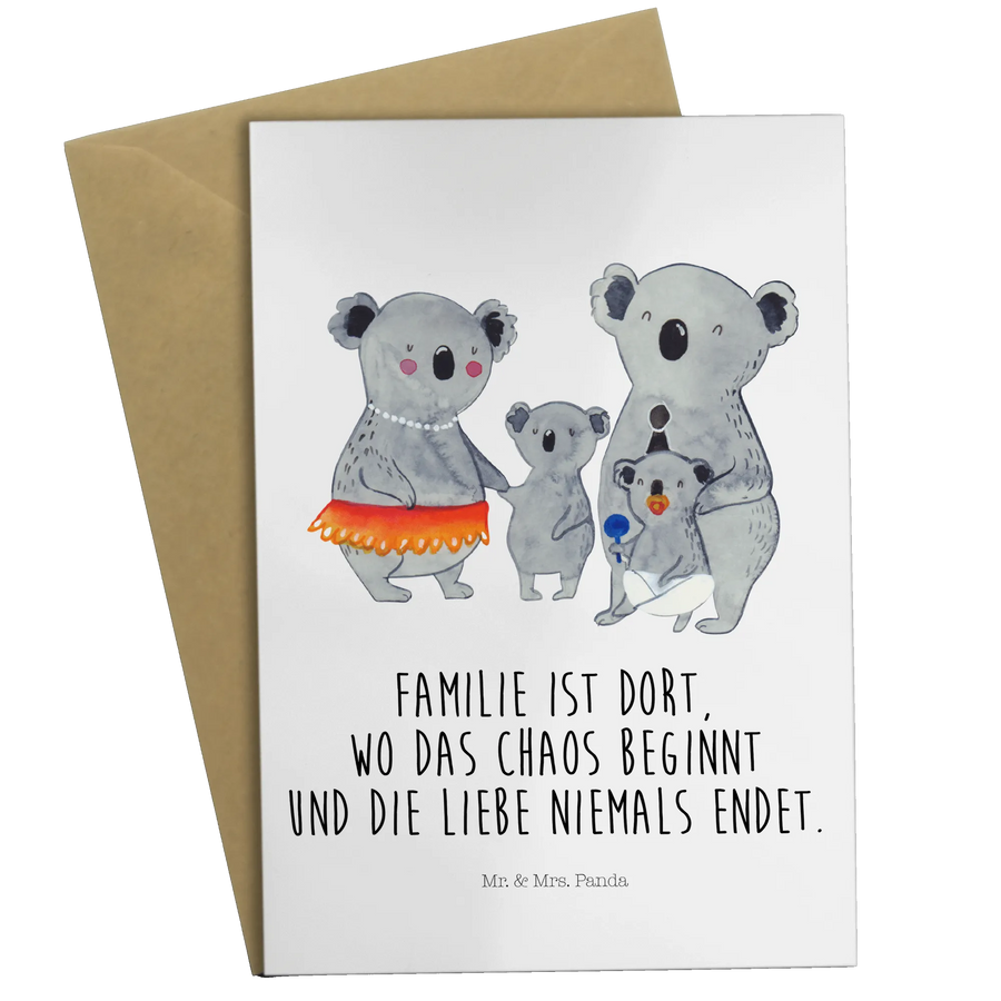 Koala Familie Grußkarte – die liebevolle Karte aus der Familien-Kollektion von Mr. & Mrs. Panda. Auf der Vorderseite siehst du eine herzliche Koala Familie: zwei größere und zwei kleinere Koalas mit süßen Accessoires. Die vertrauten, lachenden Gesichter und der warme Spruch „Familie ist dort, wo das Chaos beginnt und die Liebe niemals endet." machen diese Grußkarte zu etwas ganz Besonderem. 😊