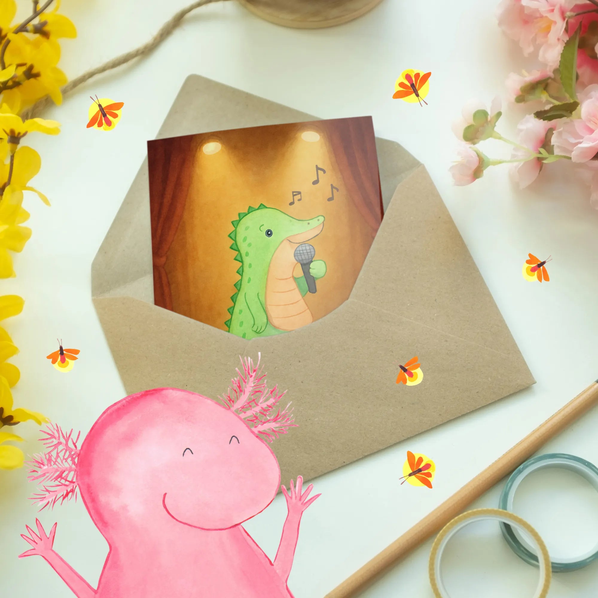 Stell dir vor: Eine bunte Band aus Freunden am Flussufer, und mittendrin unser Krokodil, das die Leadstimme übernimmt. Mit vollem Körpereinsatz und einem Lächeln, das ansteckt, führt es die Band durch ein fröhliches Stück, das von Abenteuer, Zusammenhalt und kleinen Alltagswundern erzählt. Die Instrumente – klappernde Becken, eine kleine Gitarre und ein Tamburin – umrahmen die Stimme des Krokodils, das sich als geborener Frontmann präsentiert. Dieses Motiv feiert die Nähe, die entsteht, wenn Menschen — oder Tiere — gemeinsam Musik machen, improvisieren und sich gegenseitig inspirieren. Es ist eine Ode an die Band: an die Proben im Garten, an das gemeinsame Lachen und an die Momente, in denen alle Töne wie von selbst zusammenfinden. Wer dieses Motiv trägt, zeigt Liebe zur Musik und zur Gemeinschaft. Es ist ideal für Musiker, Bandmitglieder oder einfach für alle, die das Leben als gemeinsame Jam-Session sehen und Freude am Miteinander haben.