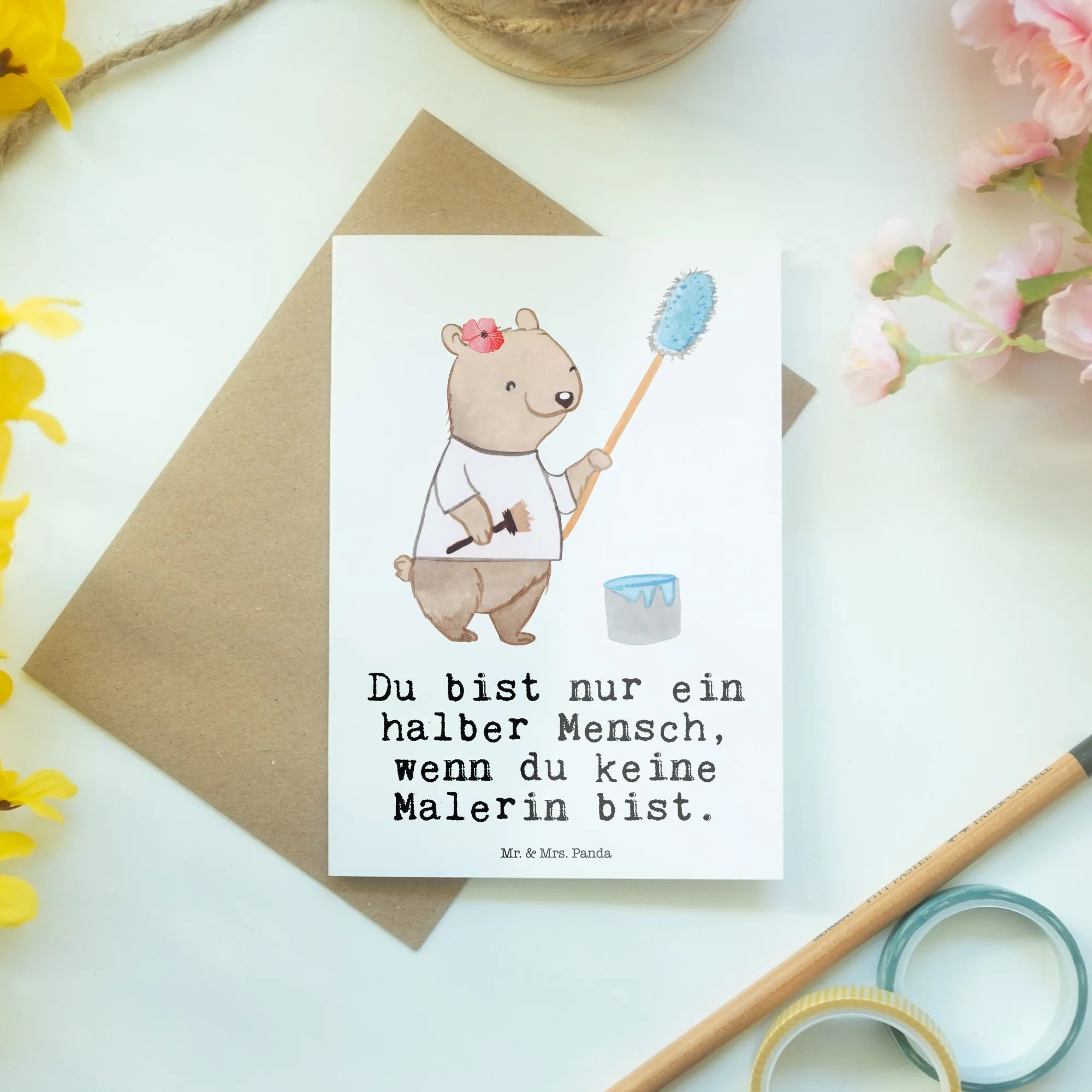Jedes Detail, von der liebevoll handgezeichneten Illustration bis hin zum eingeknickten Umschlag, zeugt von der hohen Qualität, für die Mr. & Mrs. Panda bekannt sind. Besonders schön ist der Slogan "Du bist nur ein halber Mensch, wenn du keine Malerin bist", der die kreative Seele jedes Malers perfekt einfängt.