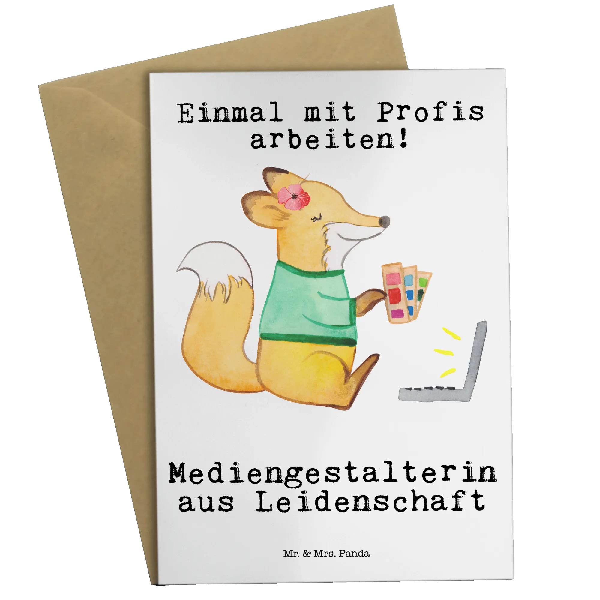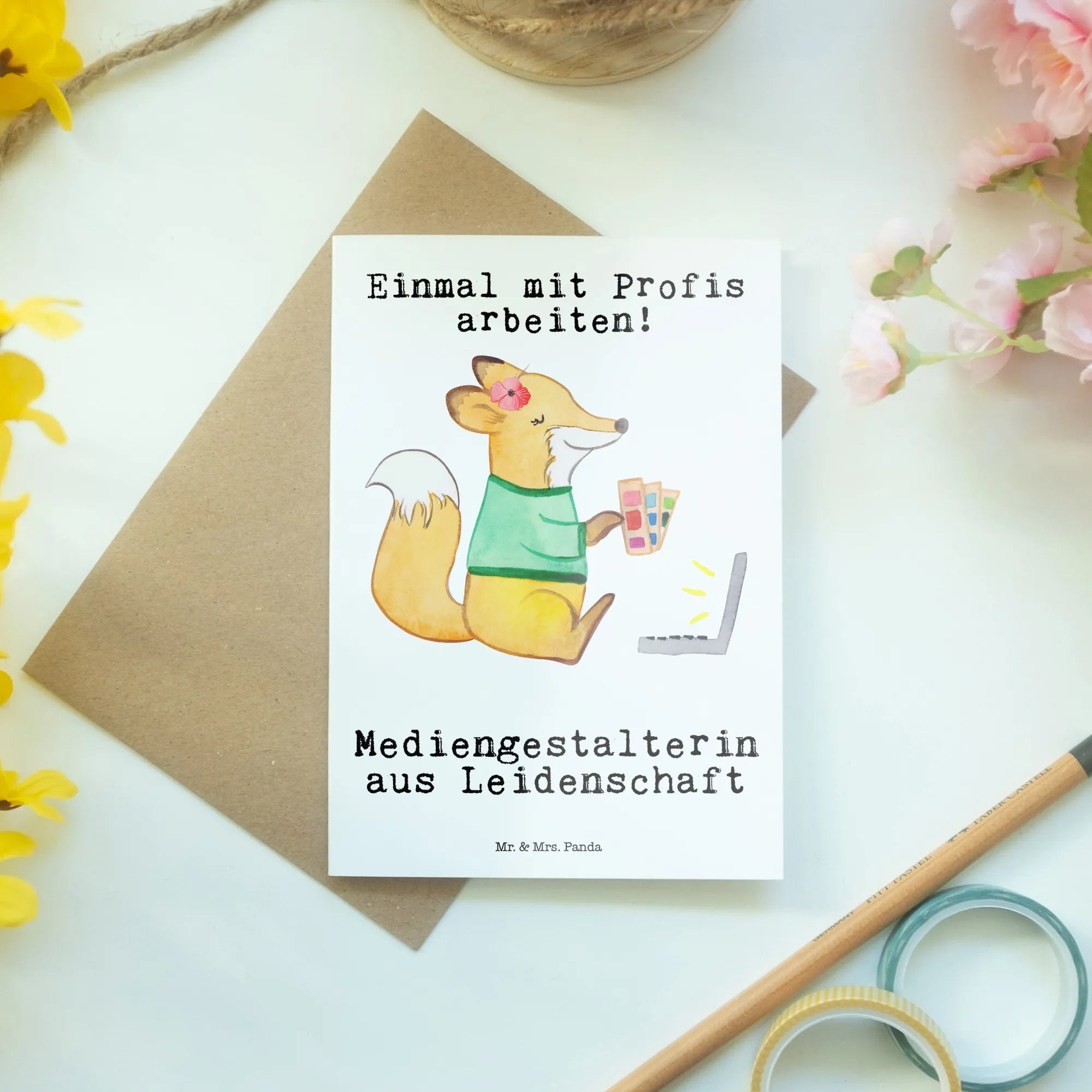 Die Grußkarte "Mediengestalterin aus Leidenschaft" von Mr. & Mrs. Panda ist das perfekte Geschenk für alle kreativen Köpfe und Grafikenthusiasten, die mit Leidenschaft in ihrem Beruf stecken. Die auf hochwertige 300 Gramm Karton gedruckte Karte bringt den süßen Fuchs, der vor einem Laptop sitzt und stolz einen Farbfächer in der Hand hält, perfekt zur Geltung. Mit dem liebevollen Spruch "Mediengestalterin aus Leidenschaft" wird sie zu einer wunderbaren Aufmerksamkeit für deine Kollegin, die sich mit Herz und Seele der Mediengestaltung widmet.