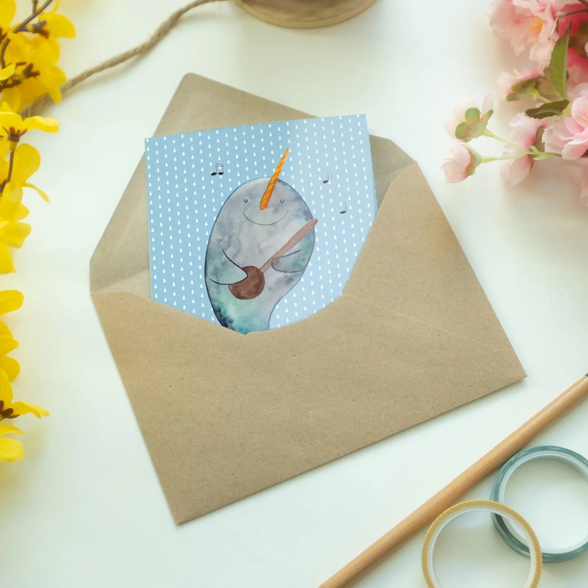 Auf der Vorderseite siehst du einen lächelnden Narwal, der mit seinem langen, spiralförmigen Stoßzahn begeistert Gitarre spielt. Umgeben von musikalischen Noten bringt dieser Narwal eine fröhliche Melodie in dein Leben und sorgt dafür, dass jeder sofort gute Laune bekommt. Die sanften Blau- und Grautöne mit Aquarelleffekten unterstreichen die maritime Herkunft und machen die Karte zu einem echten Hingucker.