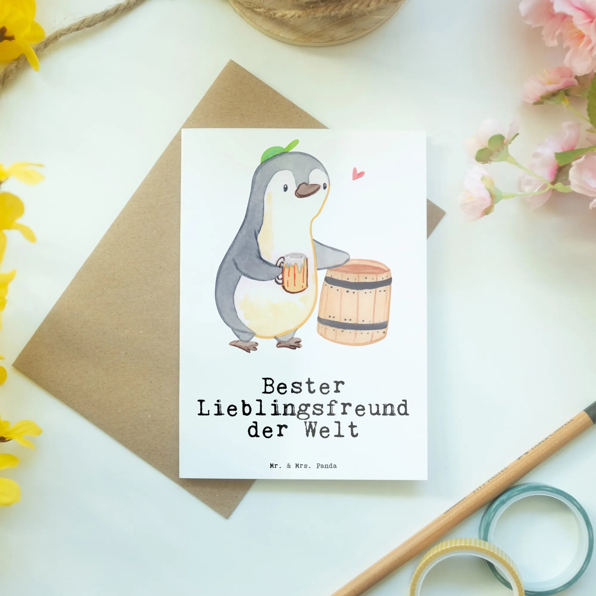 Entdecke die perfekte Grußkarte für deinen besten Freund – die entzückende Pinguin Grußkarte "Bester Lieblingsfreund der Welt" aus der Kollektion Beziehungen von Mr. & Mrs. Panda. Diese liebevoll gestaltete Karte ist mehr als nur ein Stück Papier; sie ist ein herzliches Dankeschön, eine Einladung oder eine liebevolle Grußbotschaft an deinen Lieblingsmenschen. Mit ihrer einzigartigen Illustration eines süßen Pinguins, der begeistert ein Bier zapft, verleiht sie jedem Anlass eine besondere Note.