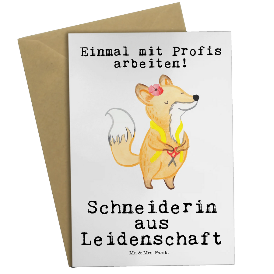 Die Grußkarte "Schneiderin aus Leidenschaft" von Mr. & Mrs. Panda ist das perfekte Geschenk für alle, die das Schneidern lieben. Mit ihrem charmanten Motiv eines stolzen Fuchses, der ein Maßband trägt und eine Schere in der Hand hält, weckt sie die Kreativität und Freude, die das Schneiderhandwerk ausmacht.