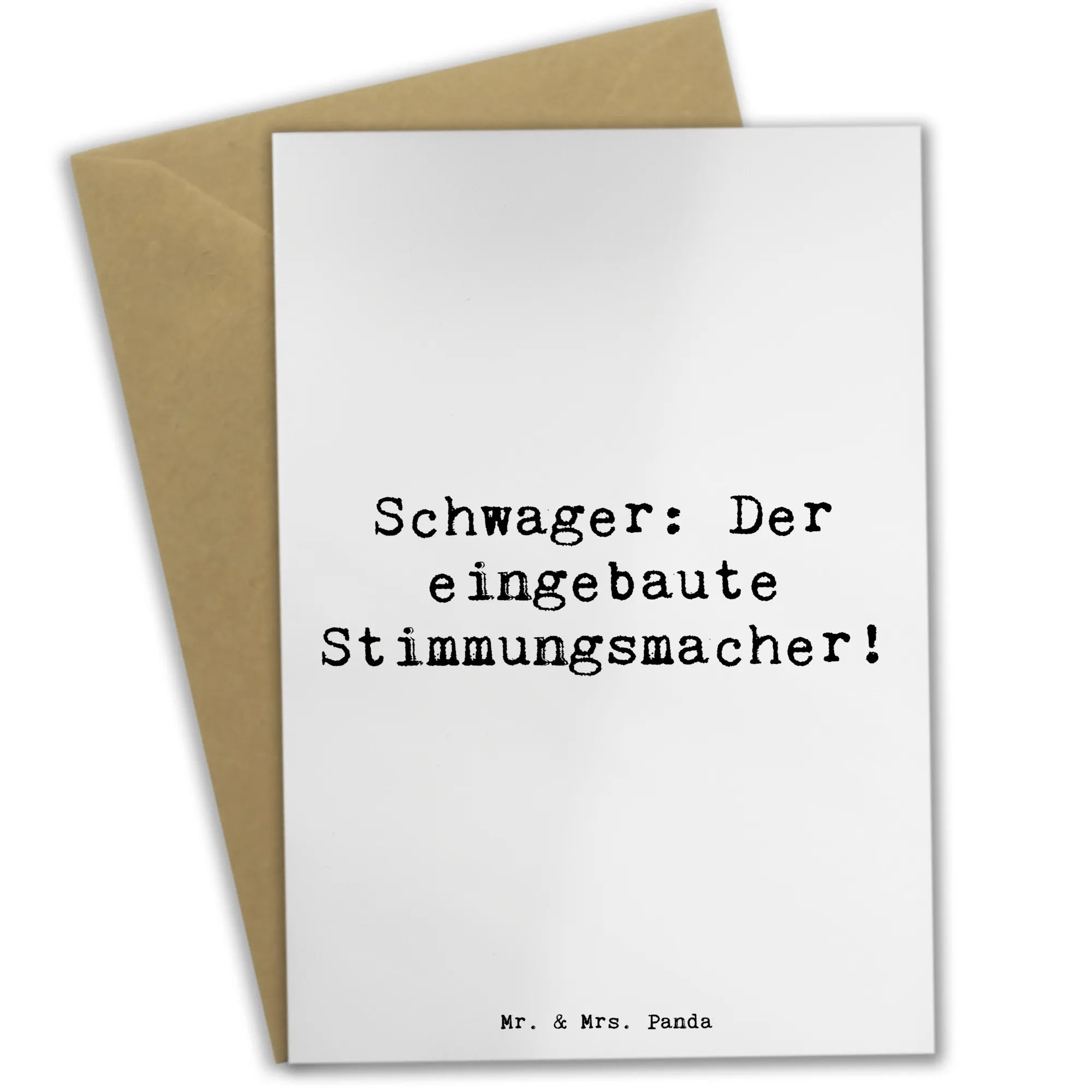 Du möchtest deinem Schwager mal richtig zeigen, wie wichtig er dir ist? Dann ist die liebevoll gestaltete Grußkarte von Mr. & Mrs. Panda genau das richtige Geschenk! Diese wunderbare Klappkarte aus hochwertigem 300 Gramm Karton zeigt auf der Vorderseite den Spruch "Schwager: Der eingebaute Stimmungsmacher!". Leicht verständlich und voller Herz, wird damit nicht nur ein richtiger Gute-Laune-Moment verschenkt, sondern auch ein Stückchen Liebe.
