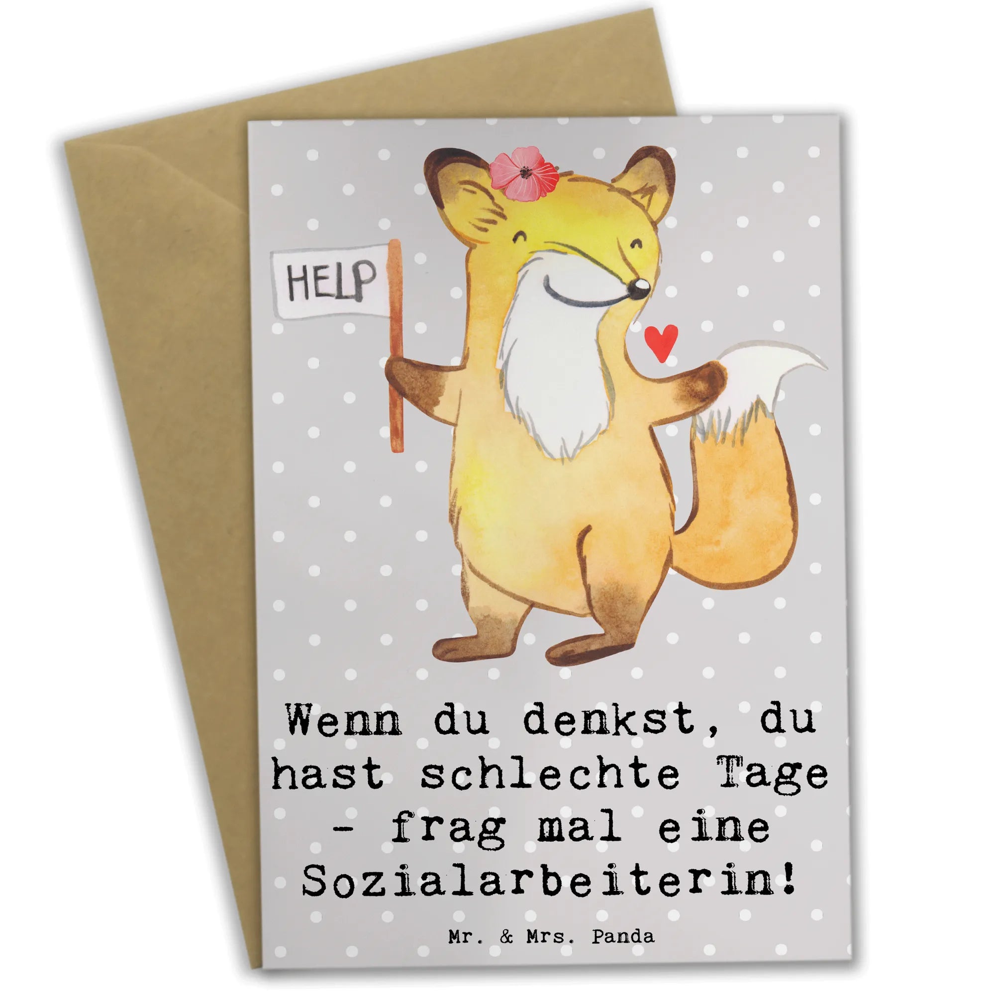 Die Grußkarte "Sozialarbeiterin" aus der einzigartigen Kollektion von Mr. & Mrs. Panda ist das perfekte Geschenk für alle, die in diesem wichtigen Beruf tätig sind oder einen Sozialarbeiter in ihrem Leben haben. Mit dem Spruch "Wenn du denkst, du hast schlechte Tage - frag mal eine Sozialarbeiterin!" zaubert diese Karte ein Lächeln auf die Gesichter der Empfänger.