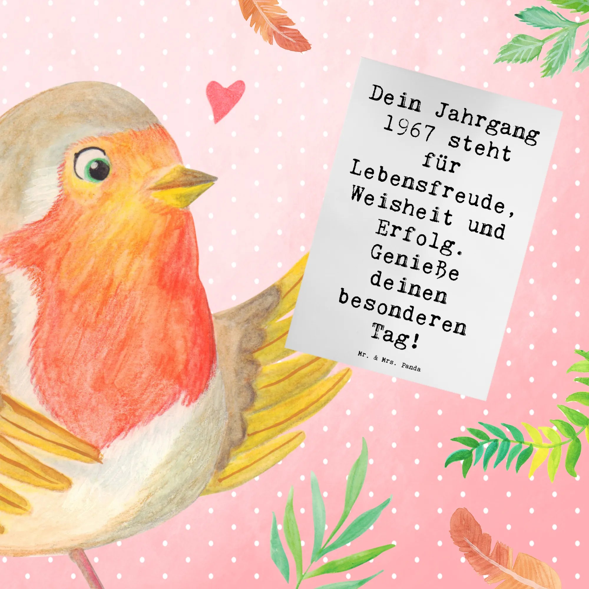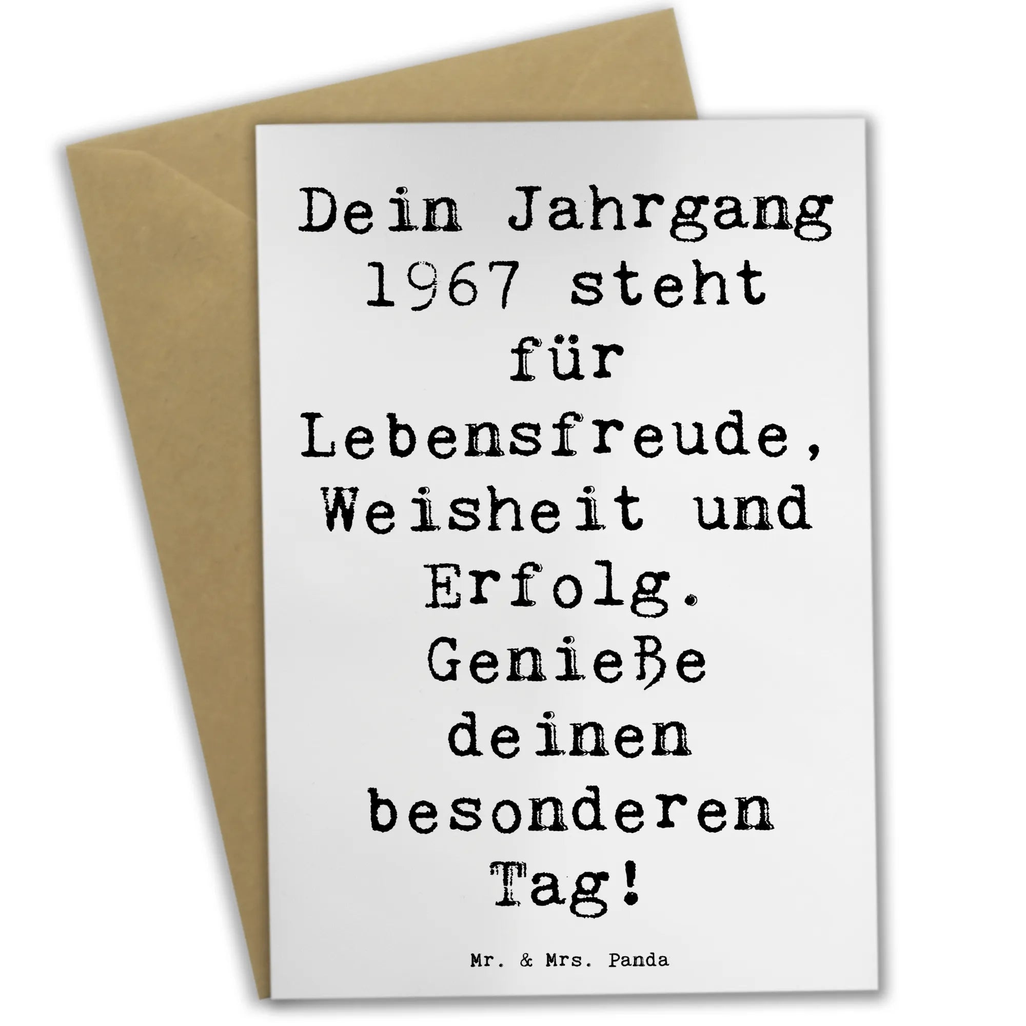 Die perfekte Grußkarte für alle, die 1967 geboren wurden! Diese einzigartige Karte von Mr. & Mrs. Panda ist nicht nur ein einfaches Stück Papier, sondern ein liebevoll gestaltetes Kunstwerk, das besondere Erinnerungen weckt. Mit dem Spruch 'Dein Jahrgang 1967 steht für Lebensfreude, Weisheit und Erfolg. Genieße deinen besonderen Tag!' wird jeder Geburtstag zu einem unvergesslichen Erlebnis.