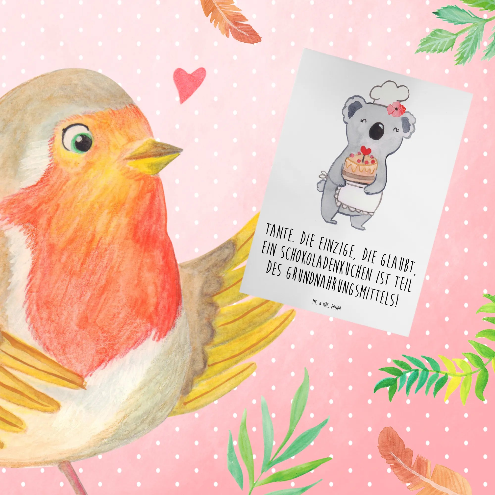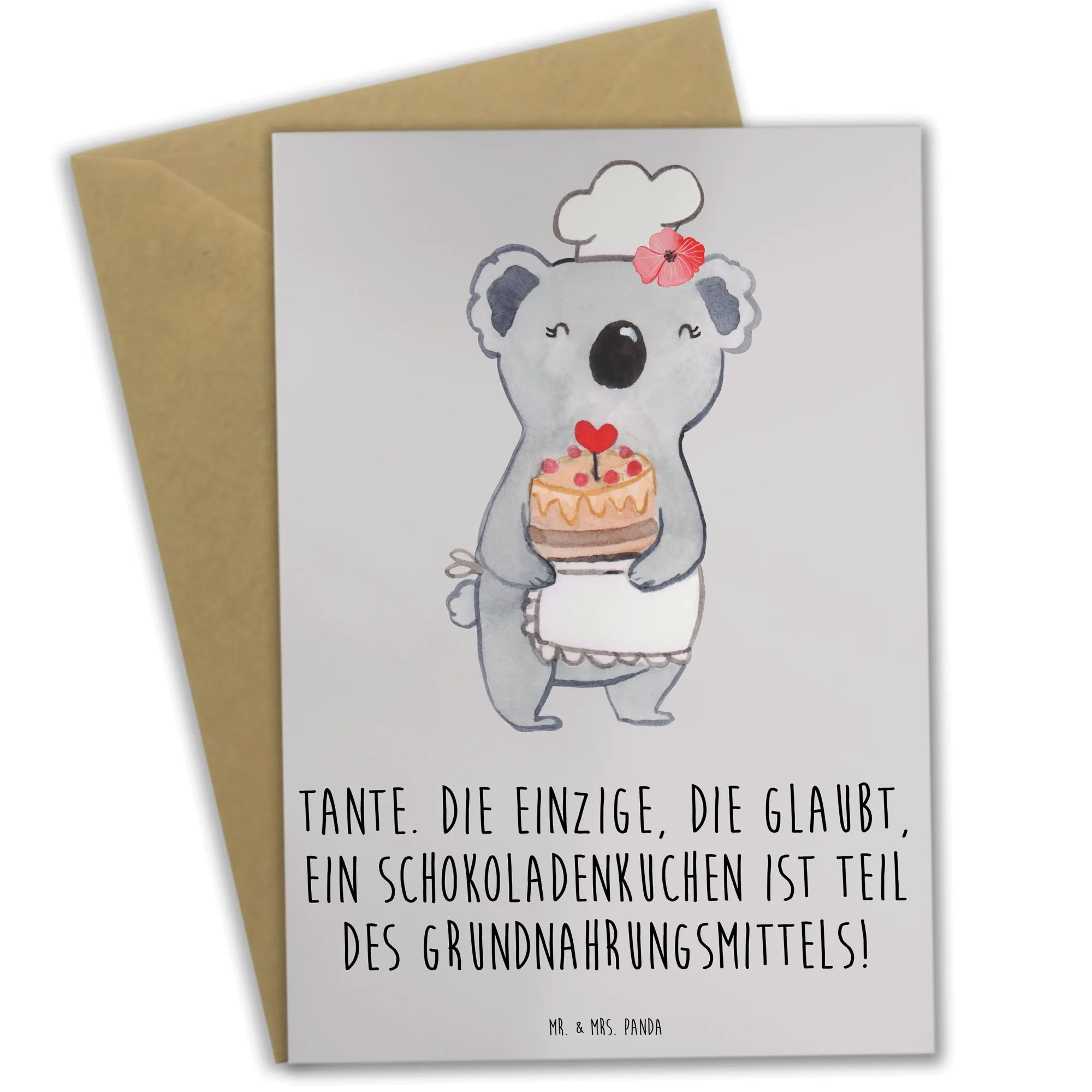 Eine liebevolle Grußkarte für Deine Tante – direkt aus der Kollektion Familie & Verwandte von Mr. & Mrs. Panda. Das handgezeichnete Motiv von Mrs. Panda und der charmante Spruch „Tante. Die einzige, die glaubt, ein Schokoladenkuchen ist Teil des Grundnahrungsmittels!" fangen die besondere Beziehung zwischen Tante und Nichte/Neffe perfekt ein.