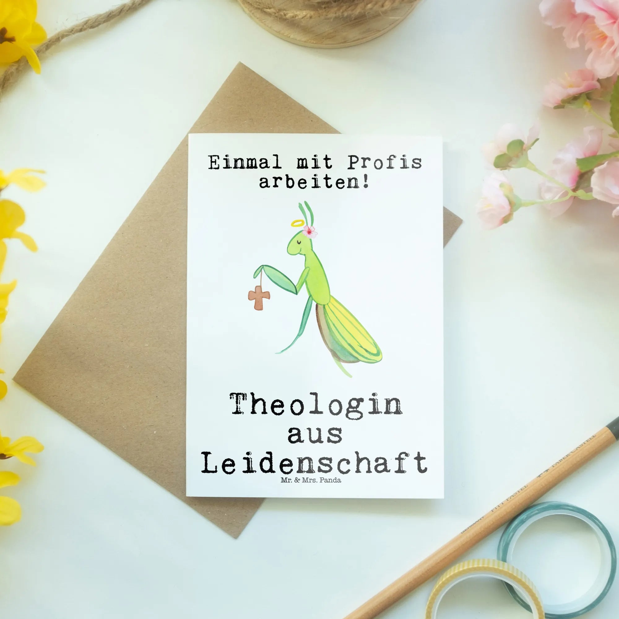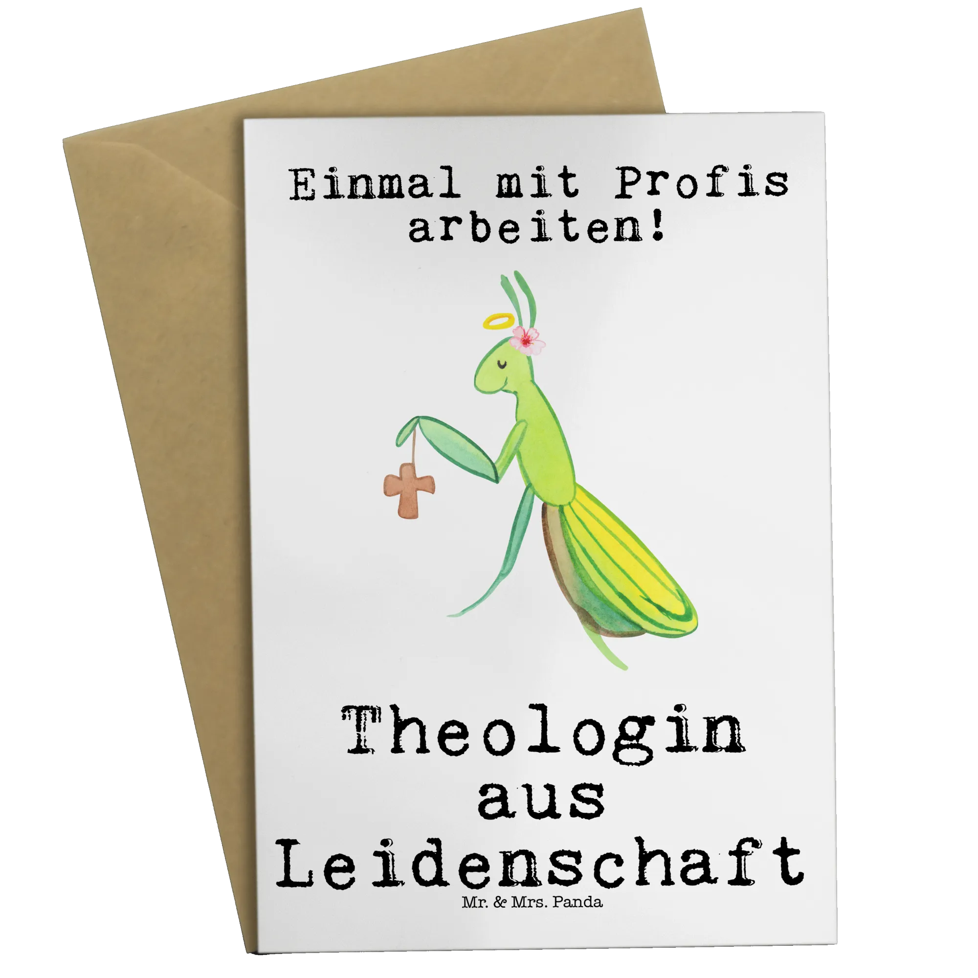 Eine wunderschöne Grußkarte von Mr. & Mrs. Panda: Die „Theologin aus Leidenschaft“-Karte aus der Berufe-Kollektion ist ein liebevolles Geschenk für Kolleginnen, Mitarbeiterinnen und Freundinnen, die Theologie mit Herz leben. Das zauberhafte Motiv zeigt eine süße Gottesanbeterin mit Heiligenschein und einem kleinen Kreuz – ein humorvolles und zugleich wertschätzendes Symbol für Berufung und Hingabe. 🎁