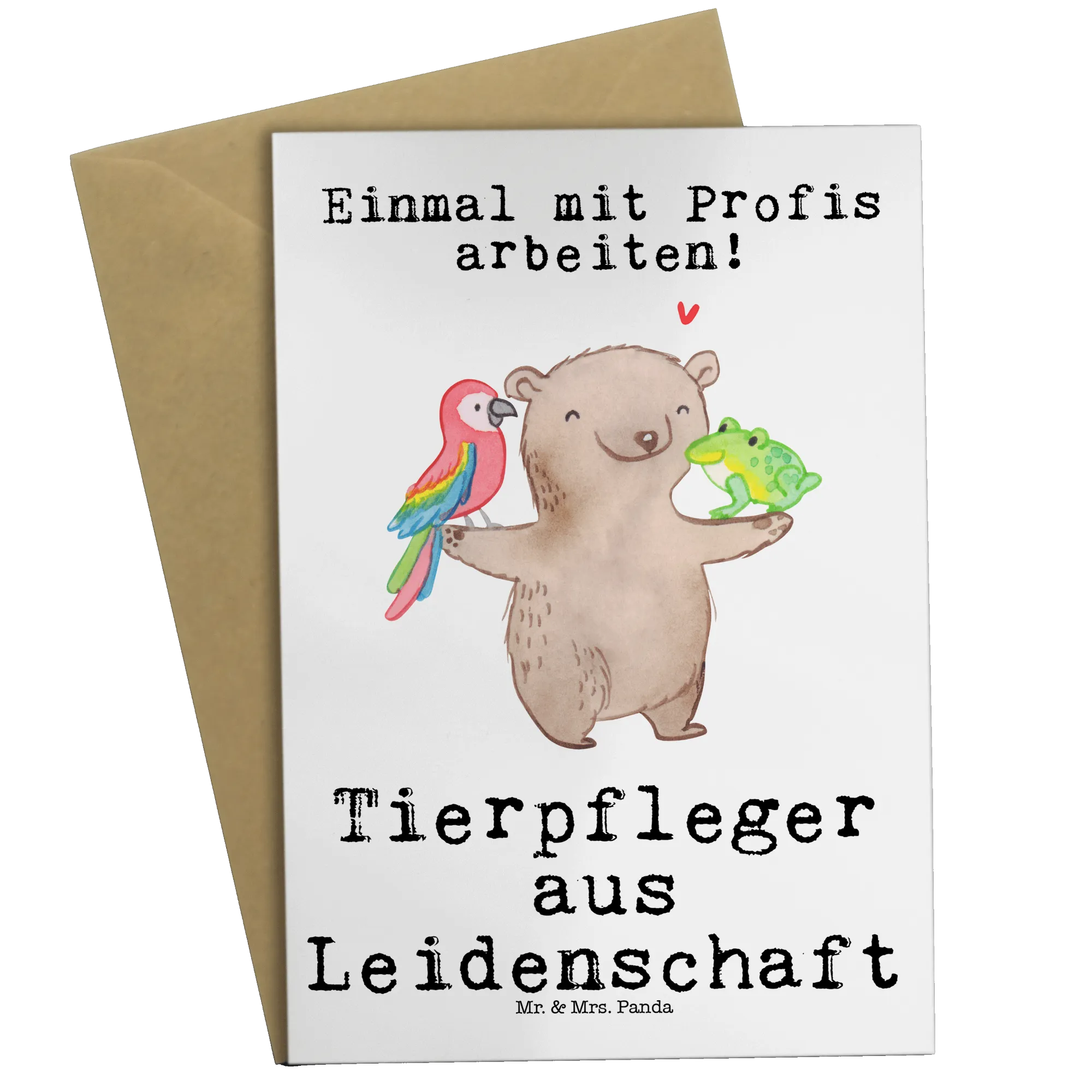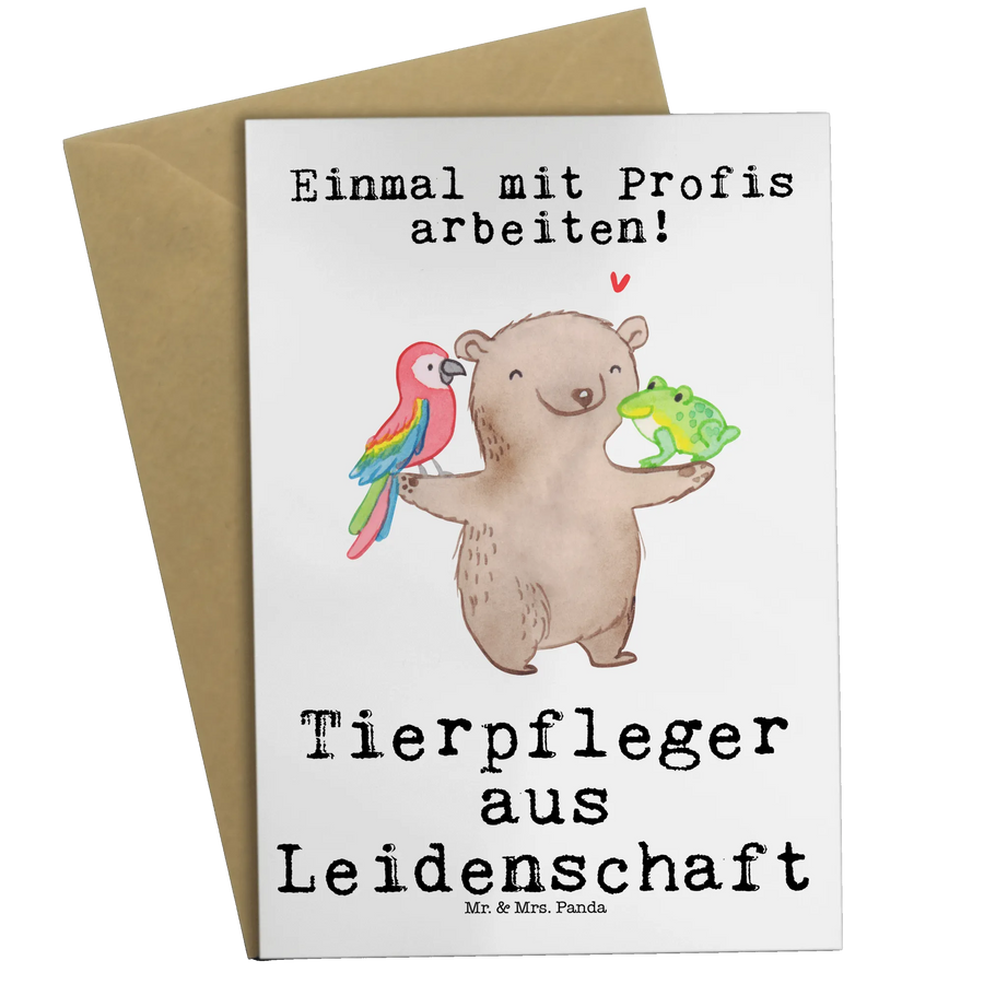 Das niedliche Motiv zeigt einen entzückenden Bären, der liebevoll um einen kleinen Papagei und einen Frosch kümmert. Die liebevollen Details und die zauberhafte Aquarellzeichnung von Mrs. Panda geben dieser Karte einen einzigartigen Charme. Diese Grußkarte ist ideal, um tierliebenden Kollegen, Freunden oder Familienmitgliedern zu einem besonderen Anlass zu gratulieren, sei es zu einem Berufsabschluss, einem Jubiläum oder einfach nur, um Danke zu sagen. Die Vorderseite ist mit dem inspirierenden Slogan "Tierpfleger aus Leidenschaft" versehen, der die Begeisterung von Menschen widerspiegelt, die für ihre Berufung leben.