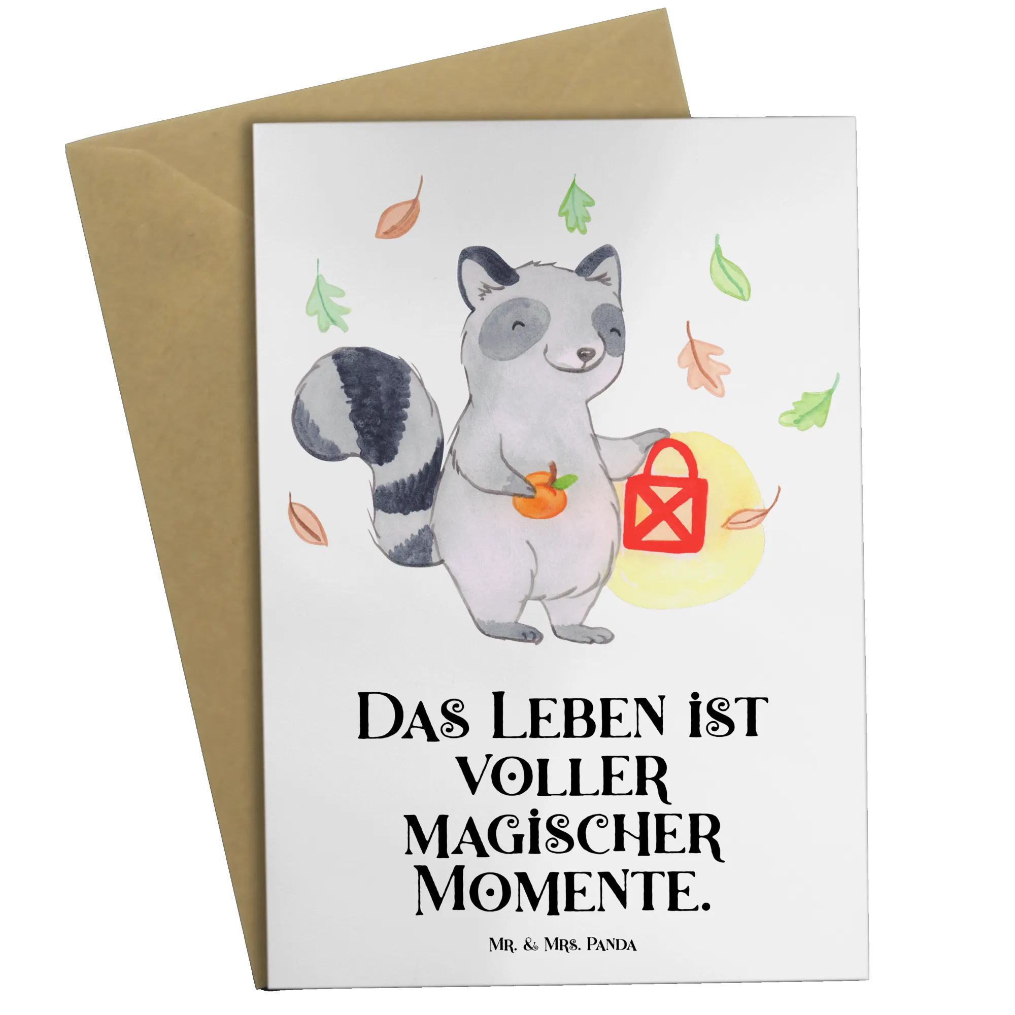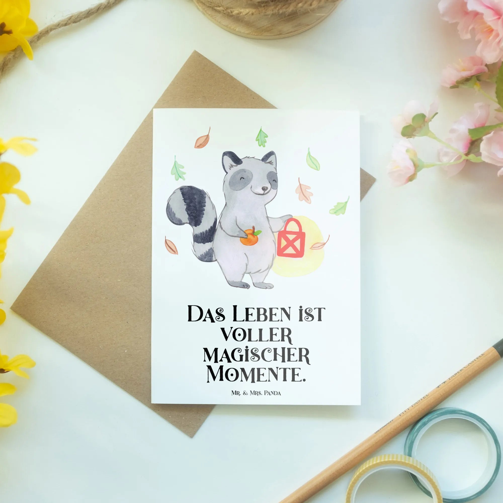 Die Grußkarte mit dem niedlichen Motiv des Waschbären mit Laterne aus der Halloween Kollektion von Mr. & Mrs. Panda begeistert nicht nur Kinder, sondern auch Erwachsene. Sie eignet sich perfekt, um liebe Grüße und herzliche Glückwünsche zu besonderen Anlässen wie Halloween, Geburtstagsfeiern oder Hochzeiten zu übermitteln.