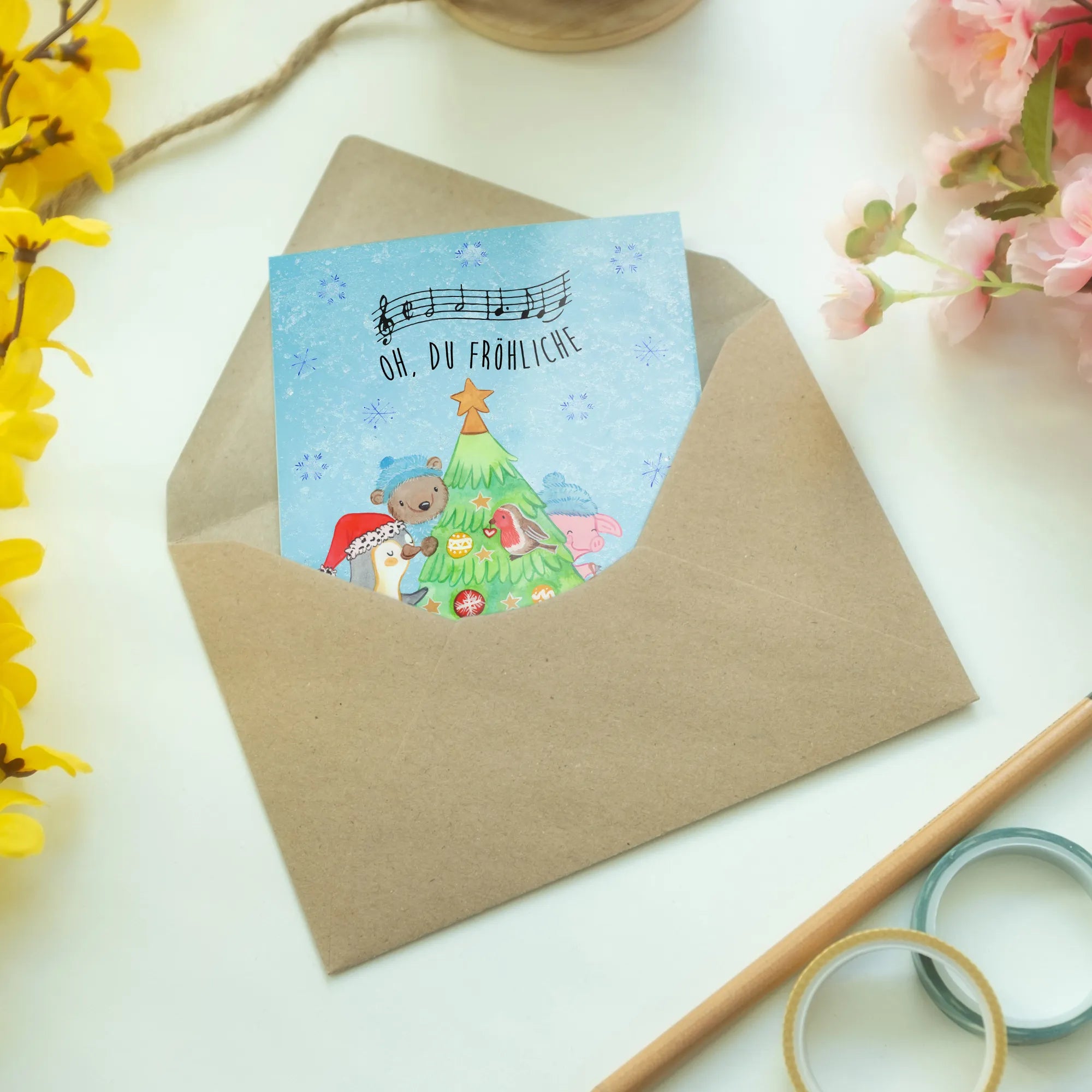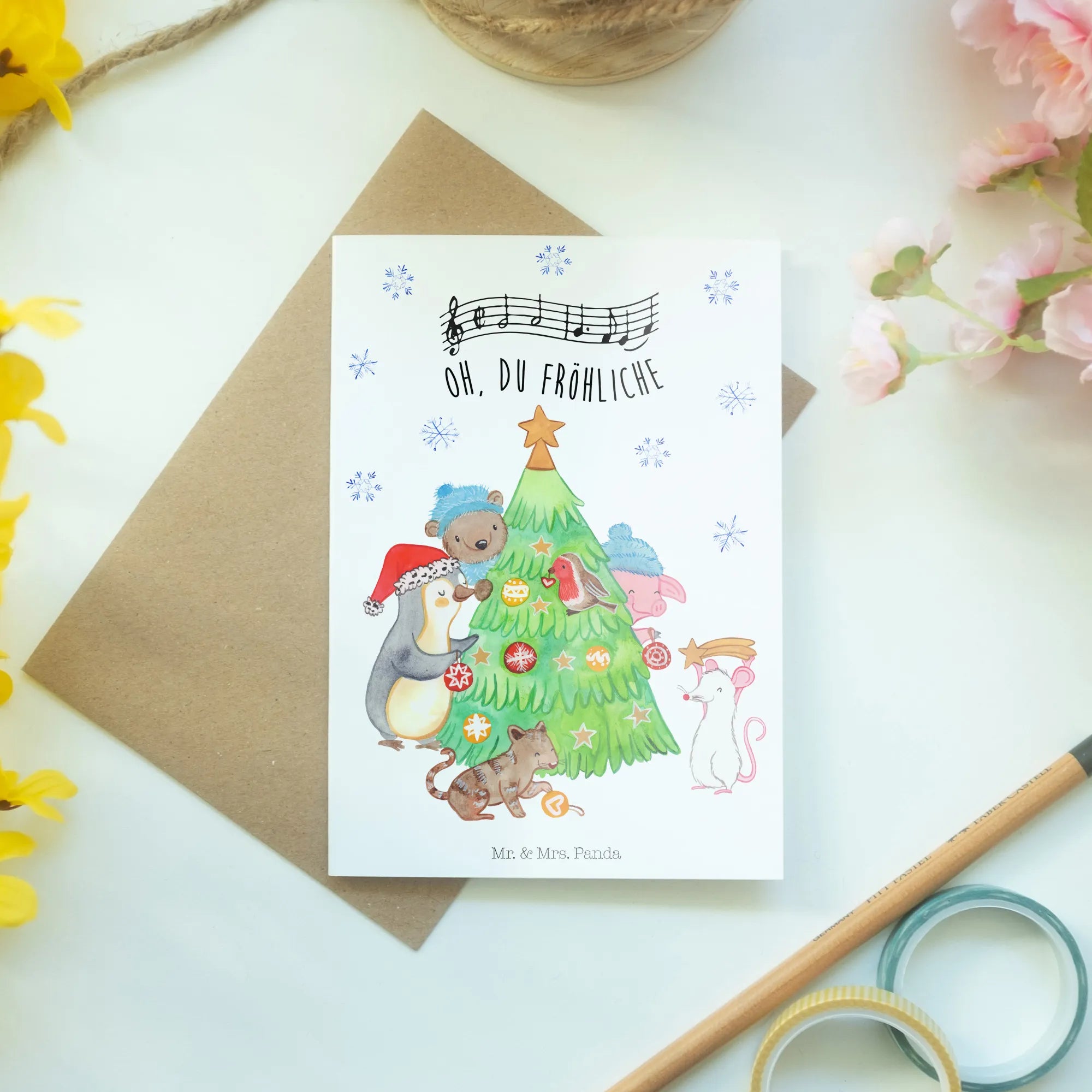 Diese schöne Karte zeigt eine Gruppe niedlicher Tiere – einen Pinguin, ein Schwein, eine Maus, eine Katze und einen Bären – die gemeinsam einen festlich geschmückten Weihnachtsbaum bewundern. Es ist wie ein kleines Stück Weihnachten in Deiner Hand!