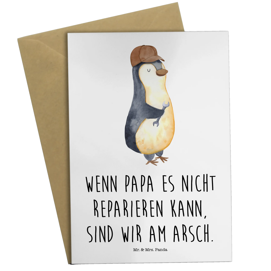 Entdecke die perfekte Grußkarte von Mr. & Mrs. Panda mit dem humorvollen Slogan "Wenn Papa es nicht reparieren kann, sind wir am Arsch". Diese Karte eignet sich großartig für Papas, die den Vatertag feiern oder einfach mal eine kleine Aufmerksamkeit verdienen. Mit einem charmanten Pinguin auf der Vorderseite, der mit einem Schraubenschlüssel posiert, strahlt sie nicht nur Witz, sondern auch jede Menge Liebe aus.