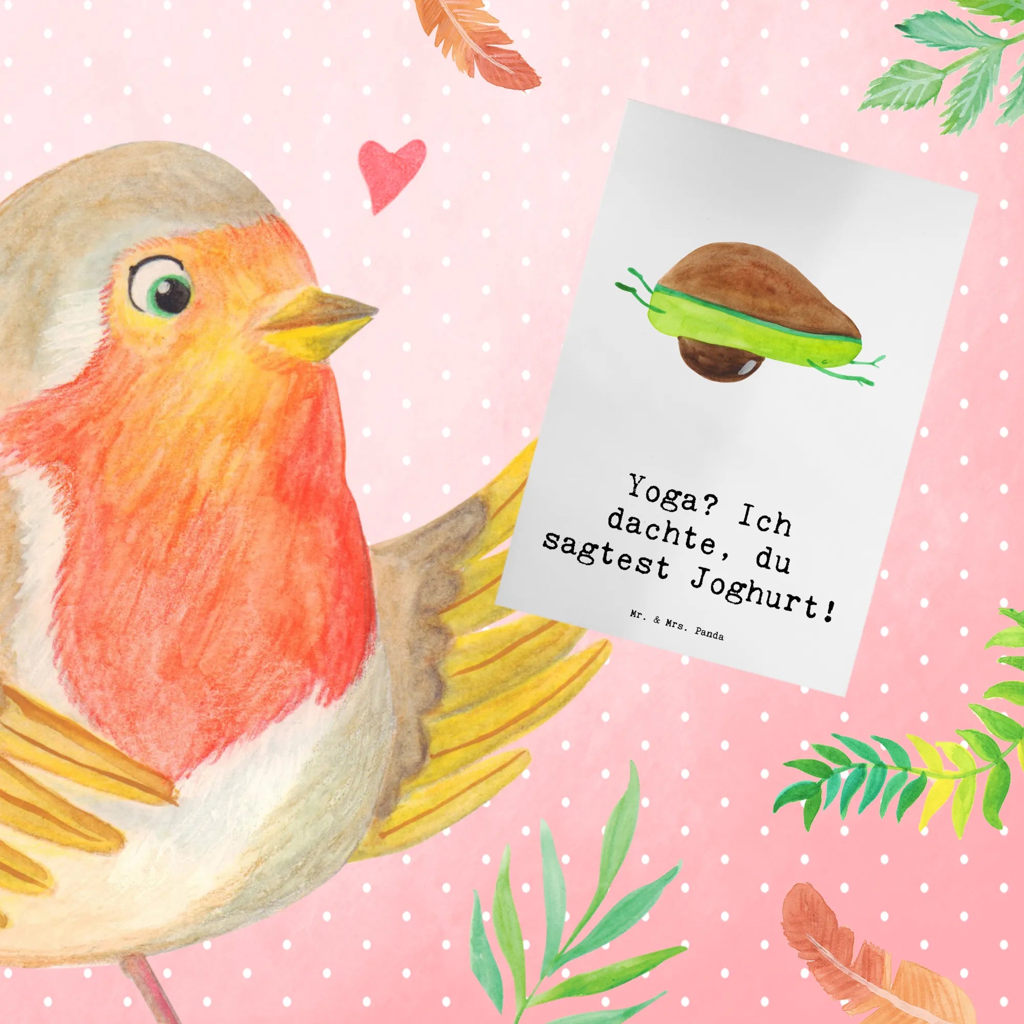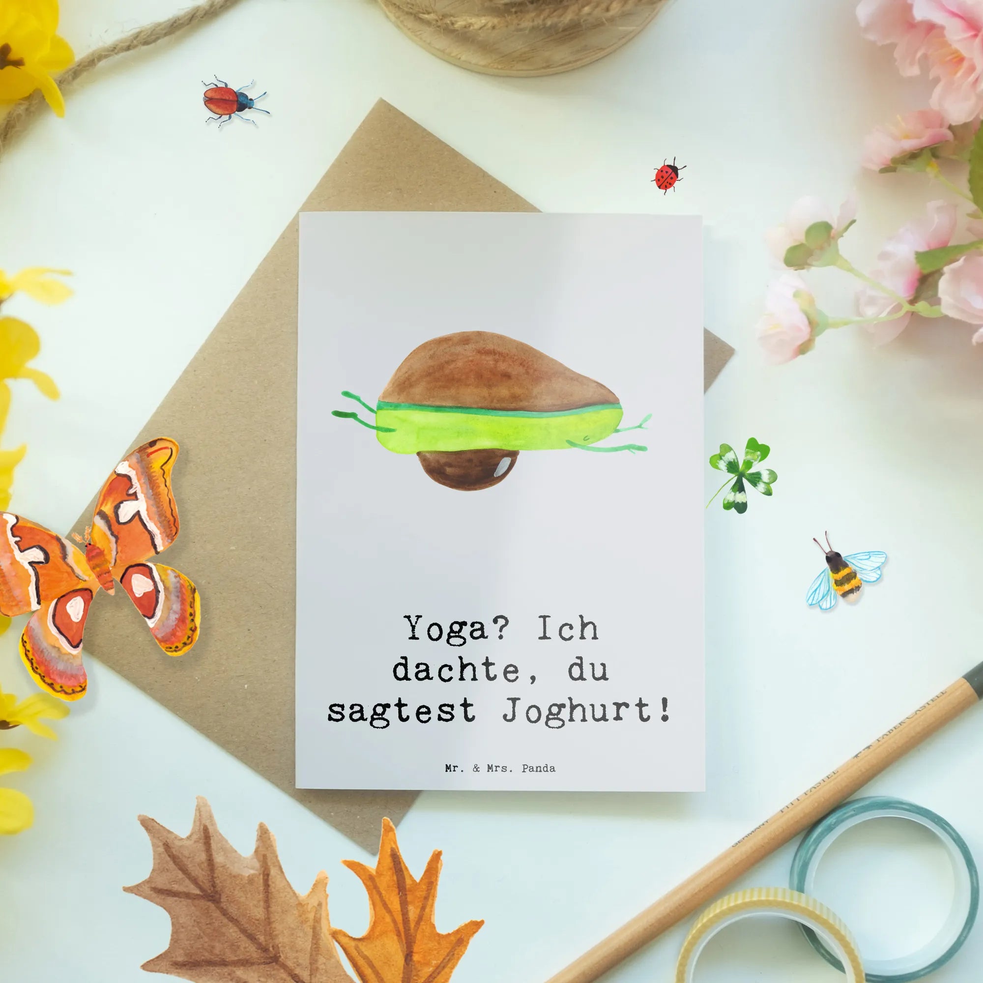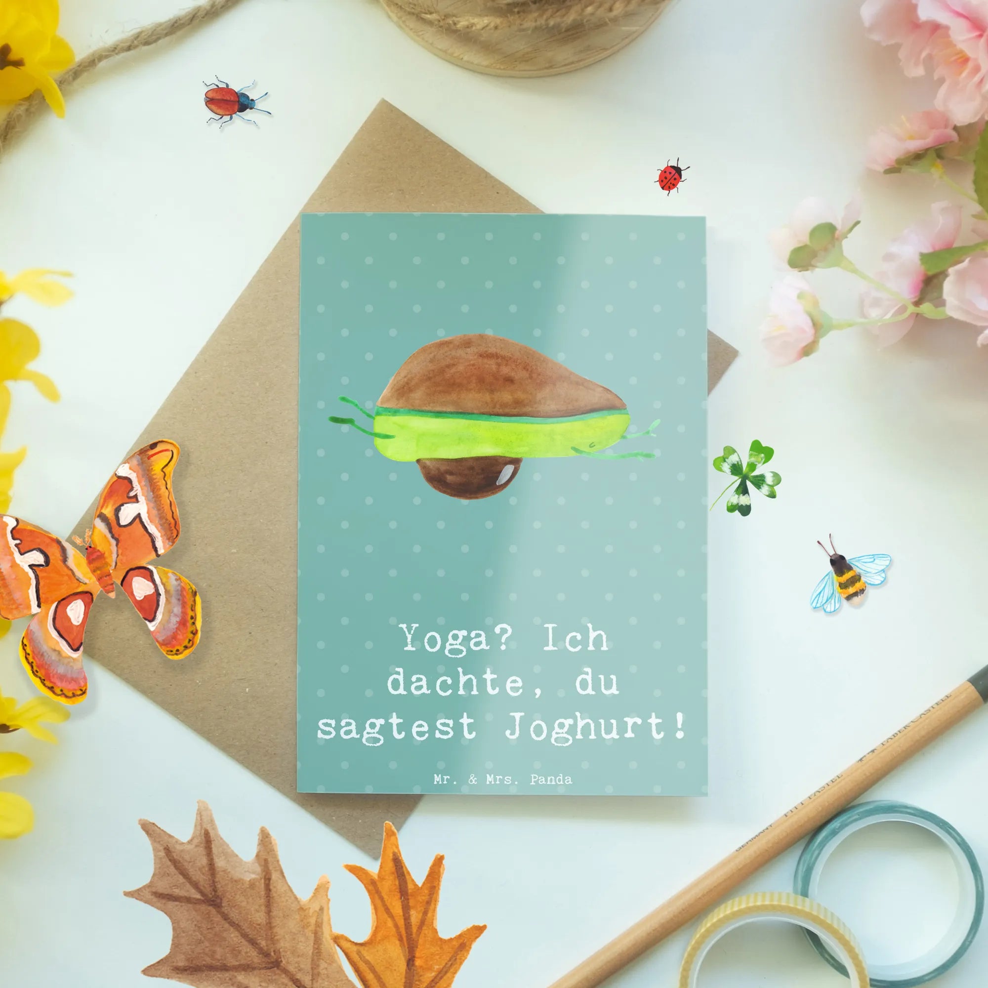 Die wunderschöne Grußkarte 'Yoga? Ich dachte, du sagtest Joghurt!' aus der Kollektion Sportarten von Mr. & Mrs. Panda ist das perfekte Geschenk für alle Sportbegeisterten und Yogaliebhaber.