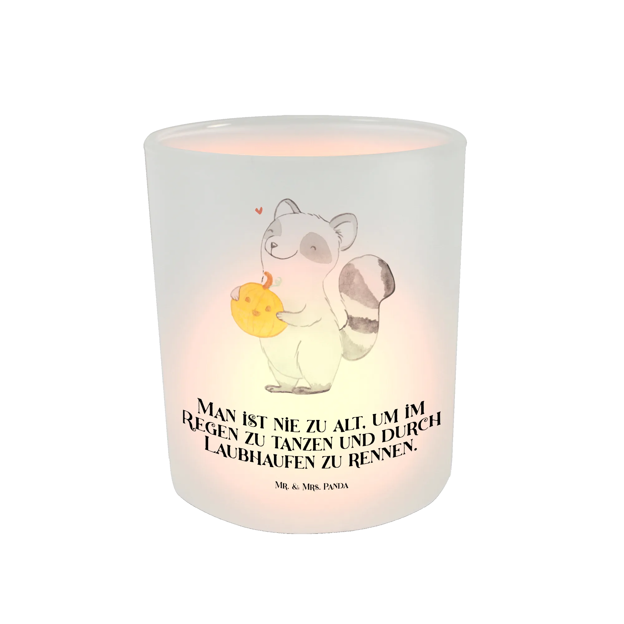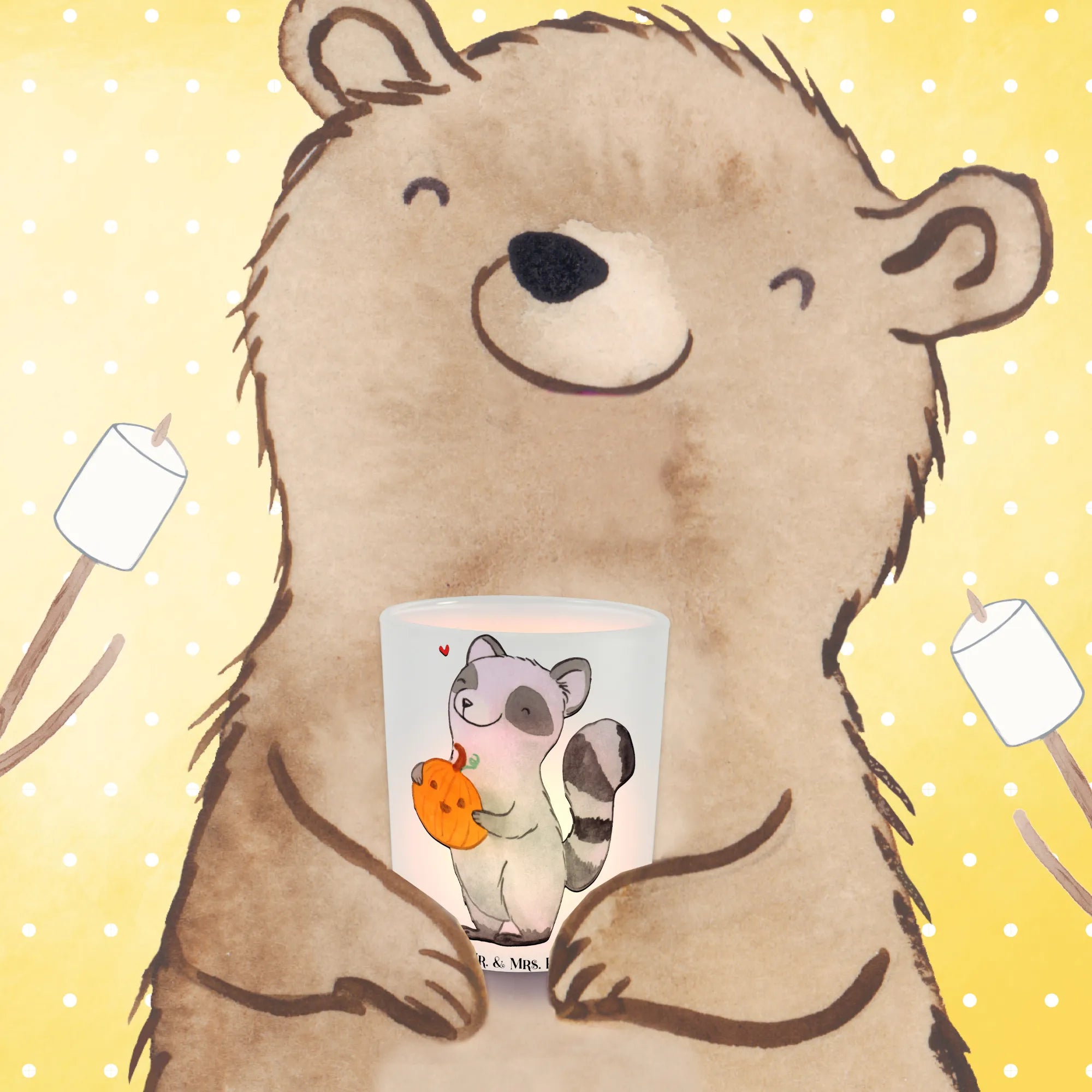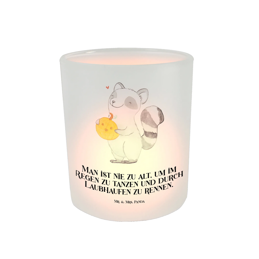 Das wundervolle Windlicht Glas mit dem fröhlichen Waschbär und dem Kürbis-Motiv von Mr. & Mrs. Panda ist das ultimative Geschenk für alle, die den Herbst in vollen Zügen genießen möchten! Dieses wunderschöne Teelichtglas bringt nicht nur gemütliches Kerzenlicht in dein Zuhause, sondern ist auch ein echter Hingucker in der herbstlichen Deko.