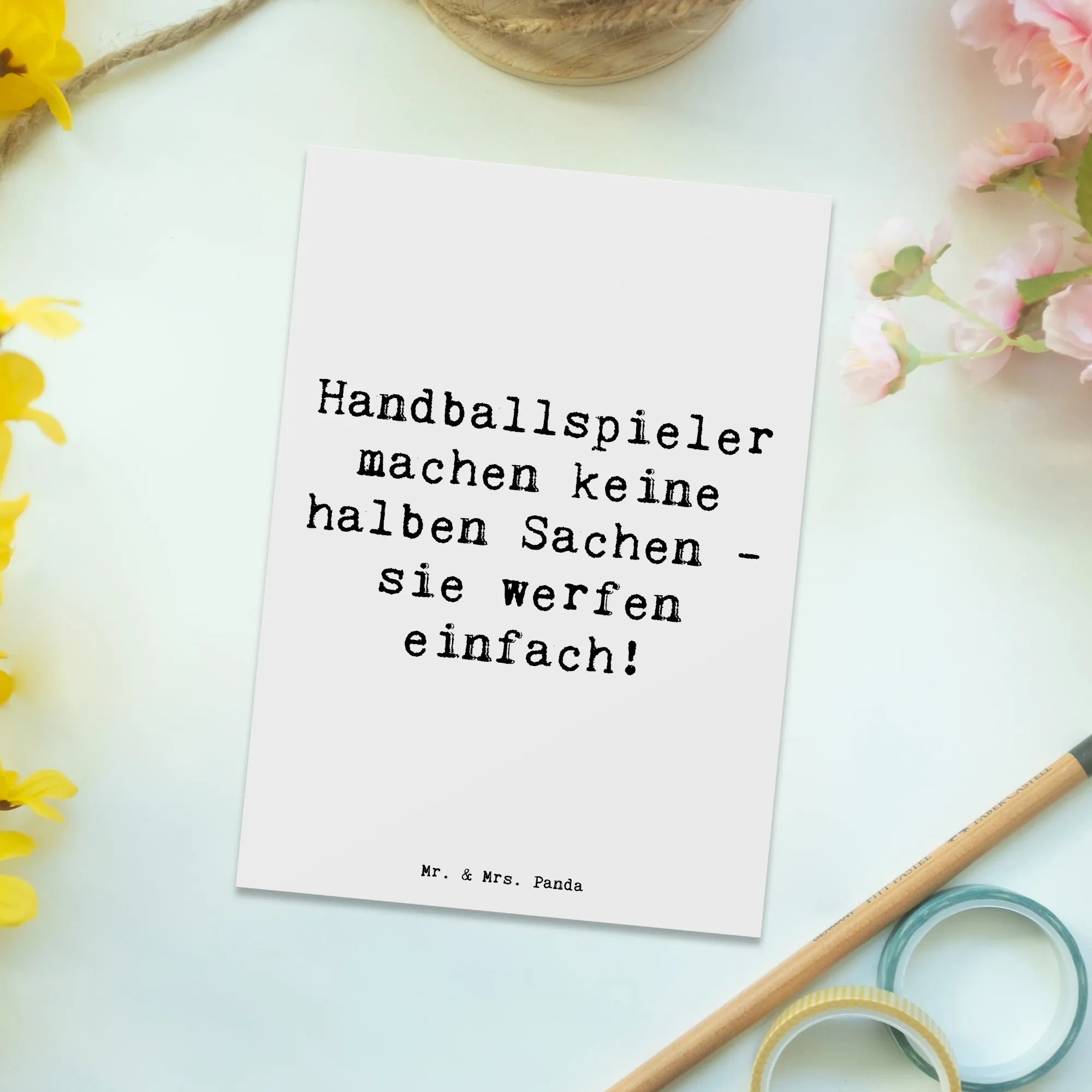 Ob zum Geburtstag, als Dankeskarte oder einfach nur so, diese Postkarte bringt ein Lächeln auf jedes Gesicht. Der Spruch "Handballspieler machen keine halben Sachen - sie werfen einfach!" sorgt dafür, dass die Karte sowohl inspirierend als auch humorvoll ist. Mit einer blanko Rückseite zur individuellen Gestaltung kannst du deinem persönlichen Touch hinzufügen, während die hochglänzend veredelte Vorderseite alle Blicke auf sich zieht.