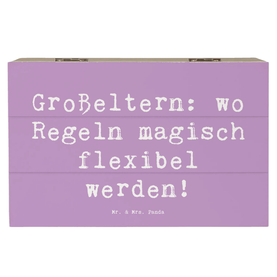 Diese wunderschöne Holzkiste von Mr. & Mrs. Panda ist der perfekte Begleiter für alle wunderbaren Erinnerungen, die Du so sehr schätzt. Mit einem liebevollen Motiv, das Großeltern gewidmet ist, wird diese Kiste zum besonderen Aufbewahrungsort für wertvolle Schätze und besondere Momente in Deinem Familienleben. Sie eignet sich hervorragend als Erinnerungskiste, um Fotos, kleine Andenken oder die schönsten Erlebnisse mit Deinen Enkelkindern aufbewahren zu können. Die Aussage "Großeltern: wo Regeln magisch flexibel werden!" bringt die besondere Beziehung zwischen Großeltern und Enkeln wunderbar auf den Punkt und zaubert jedem ein Lächeln ins Gesicht.